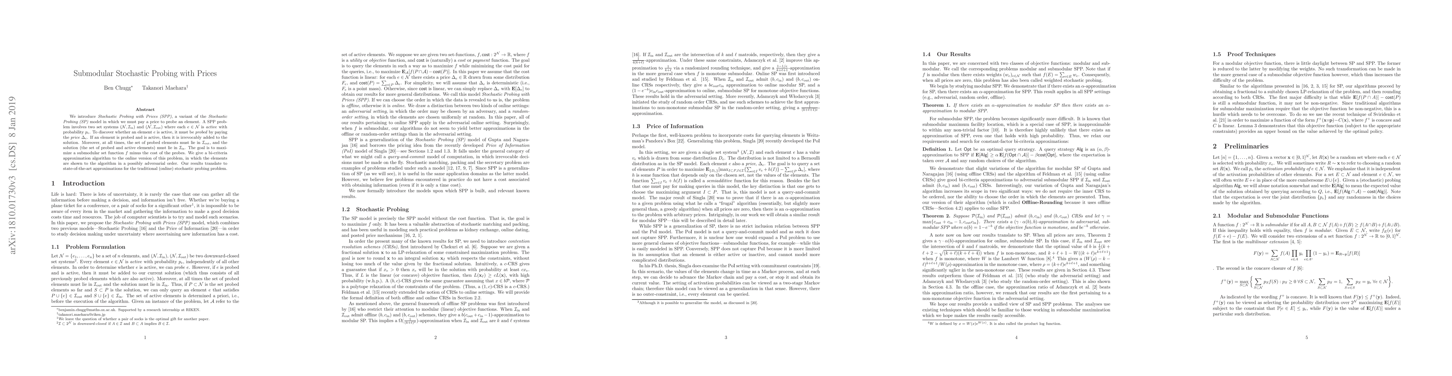 This paper introduces Stochastic Probing with Prices (SPP), a variant of Stochastic Probing where probing elements incur costs. The goal is to maximize a set function while adhering to set constraints and minimizing probe costs, and the authors propose a bi-criteria approximation algorithm for the online version.