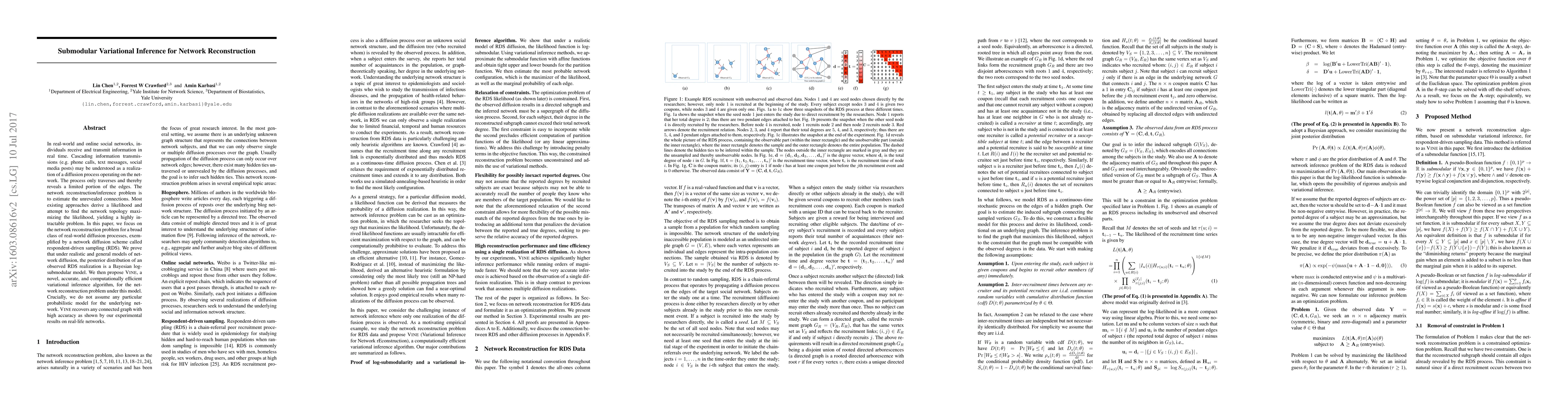 In real-world and online social networks, individuals receive and transmit information in real time. Cascading information transmissions (e.g. phone calls, text messages, social media posts) may be understood as a realization of a diffusion process operating on the network, and its branching path can be represented by a directed tree. The process only traverses and thus reveals a limited portion of the edges. The network reconstruction/inference problem is to infer the unrevealed connections. Most existing approaches derive a likelihood and attempt to find the network topology maximizing the likelihood, a problem that is highly intractable. In this paper, we focus on the network reconstruction problem for a broad class of real-world diffusion processes, exemplified by a network diffusion scheme called respondent-driven sampling (RDS). We prove that under realistic and general models of network diffusion, the posterior distribution of an observed RDS realization is a Bayesian log-submodular model.We then propose VINE (Variational Inference for Network rEconstruction), a novel, accurate, and computationally efficient variational inference algorithm, for the network reconstruction problem under this model. Crucially, we do not assume any particular probabilistic model for the underlying network. VINE recovers any connected graph with high accuracy as shown by our experimental results on real-life networks.