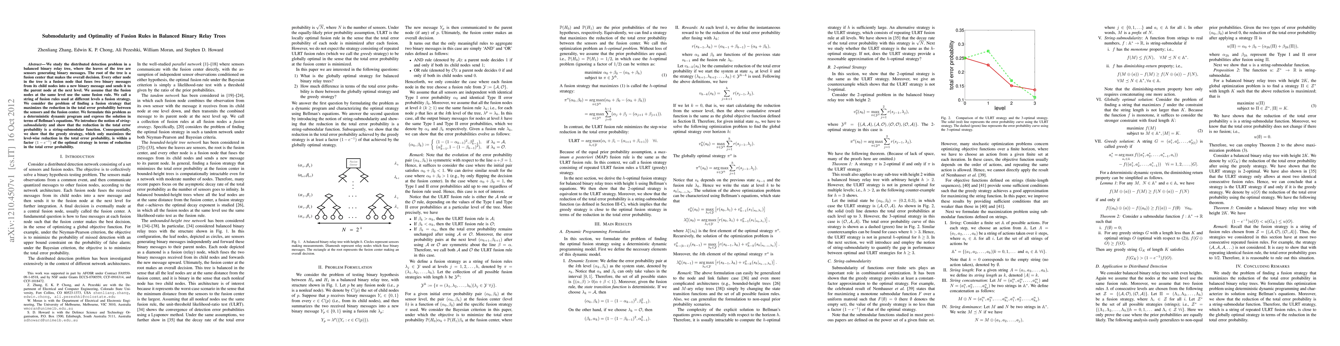 We study the distributed detection problem in a balanced binary relay tree, where the leaves of the tree are sensors generating binary messages. The root of the tree is a fusion center that makes the overall decision. Every other node in the tree is a fusion node that fuses two binary messages from its child nodes into a new binary message and sends it to the parent node at the next level. We assume that the fusion nodes at the same level use the same fusion rule. We call a string of fusion rules used at different levels a fusion strategy. We consider the problem of finding a fusion strategy that maximizes the reduction in the total error probability between the sensors and the fusion center. We formulate this problem as a deterministic dynamic program and express the solution in terms of Bellman's equations. We introduce the notion of stringsubmodularity and show that the reduction in the total error probability is a stringsubmodular function. Consequentially, we show that the greedy strategy, which only maximizes the level-wise reduction in the total error probability, is within a factor of the optimal strategy in terms of reduction in the total error probability.