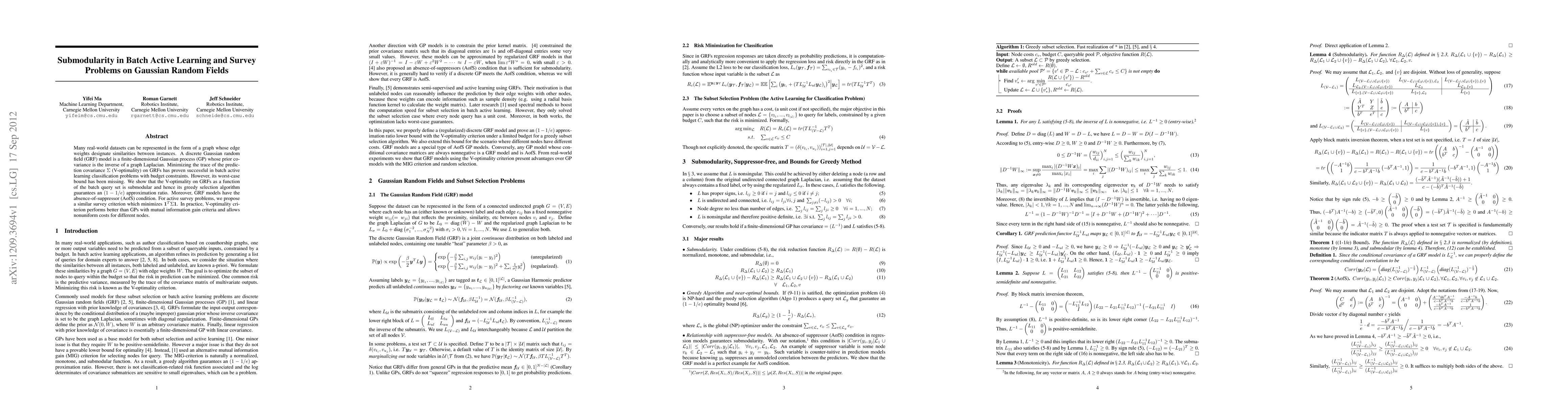 Many real-world datasets can be represented in the form of a graph whose edge weights designate similarities between instances. A discrete Gaussian random field (GRF) model is a finite-dimensional Gaussian process (GP) whose prior covariance is the inverse of a graph Laplacian. Minimizing the trace of the predictive covariance Sigma (V-optimality) on GRFs has proven successful in batch active learning classification problems with budget constraints. However, its worst-case bound has been missing. We show that the V-optimality on GRFs as a function of the batch query set is submodular and hence its greedy selection algorithm guarantees an (1-1/e) approximation ratio. Moreover, GRF models have the absence-of-suppressor (AofS) condition. For active survey problems, we propose a similar survey criterion which minimizes 1'(Sigma)1. In practice, V-optimality criterion performs better than GPs with mutual information gain criteria and allows nonuniform costs for different nodes.