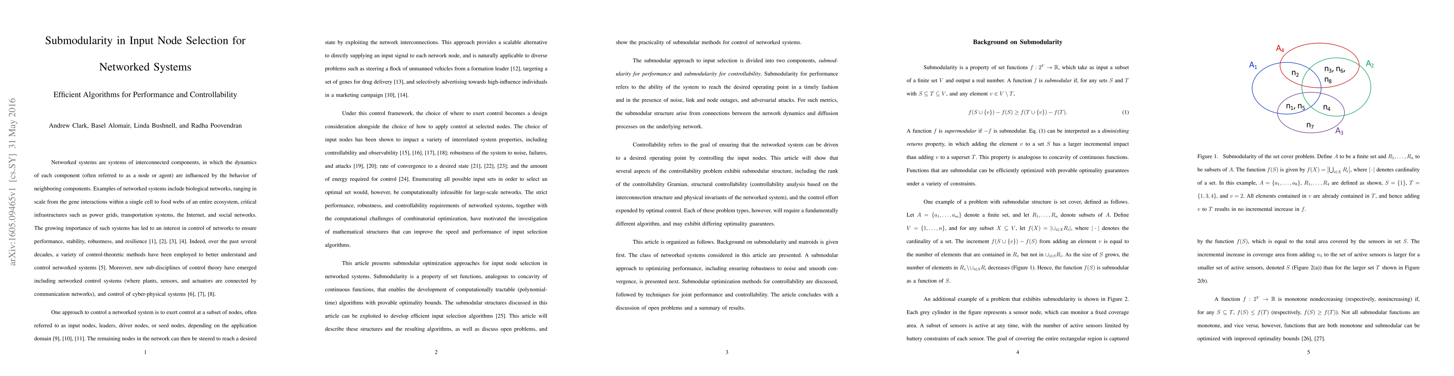This paper explores submodular optimization techniques for selecting input nodes in networked systems to ensure performance and stability. It leverages the submodularity property to develop efficient algorithms with provable optimality bounds, highlighting its application to various systems like power grids and social networks.