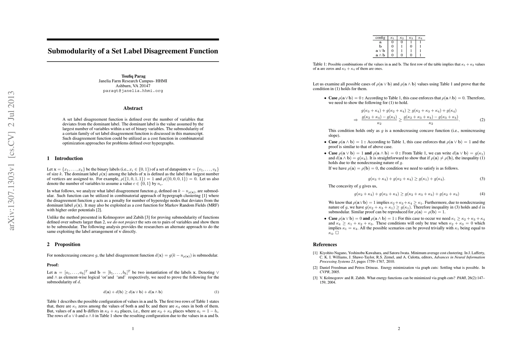 A set label disagreement function is defined over the number of variables that deviates from the dominant label. The dominant label is the value assumed by the largest number of variables within a set of binary variables. The submodularity of a certain family of set label disagreement function is discussed in this manuscript. Such disagreement function could be utilized as a cost function in combinatorial optimization approaches for problems defined over hypergraphs.