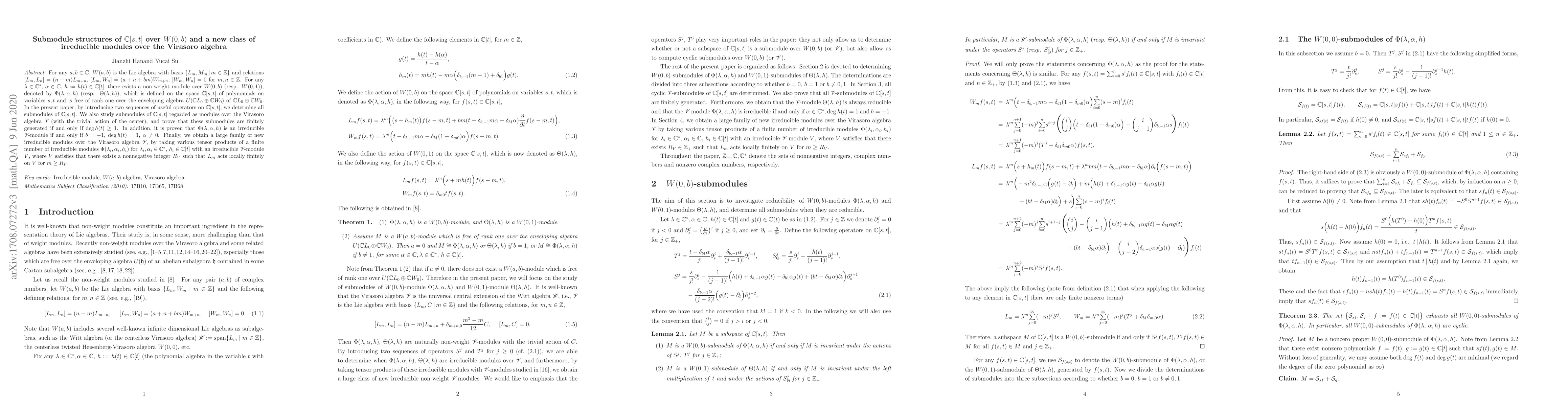 This paper explores submodule structures of $\mathbb C[s,t]$ over the Lie algebra $W(0,b)$, determining all submodules and proving their finite generation conditions. It also introduces a new class of irreducible modules over the Virasoro algebra $\mathscr V\!$, characterized by specific degrees and parameters, and constructs a large family of such irreducible modules via tensor products.