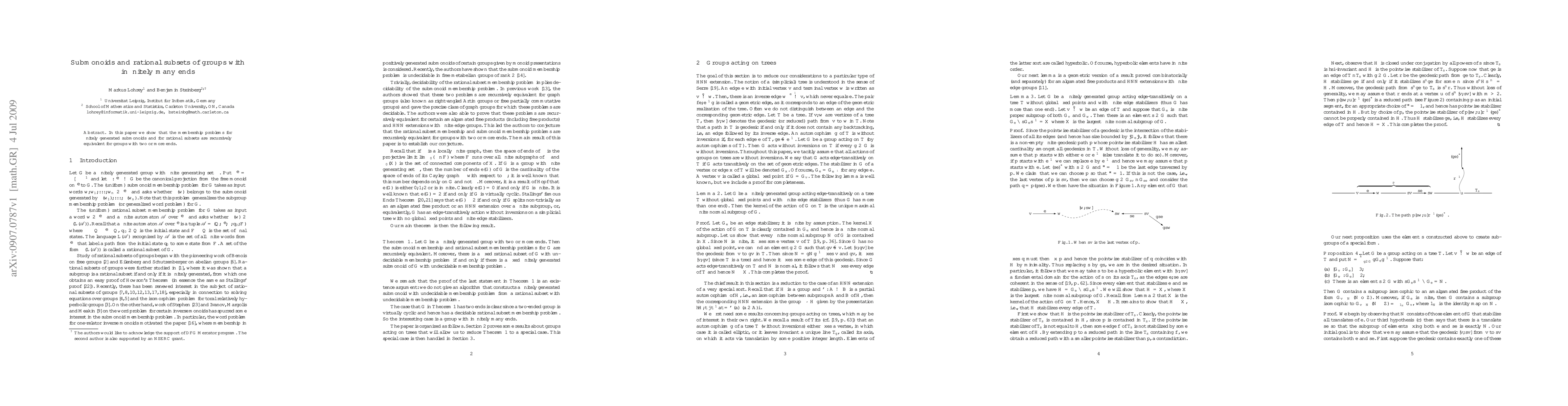 In this paper we show that the membership problems for finitely generated submonoids and for rational subsets are recursively equivalent for groups with two or more ends.