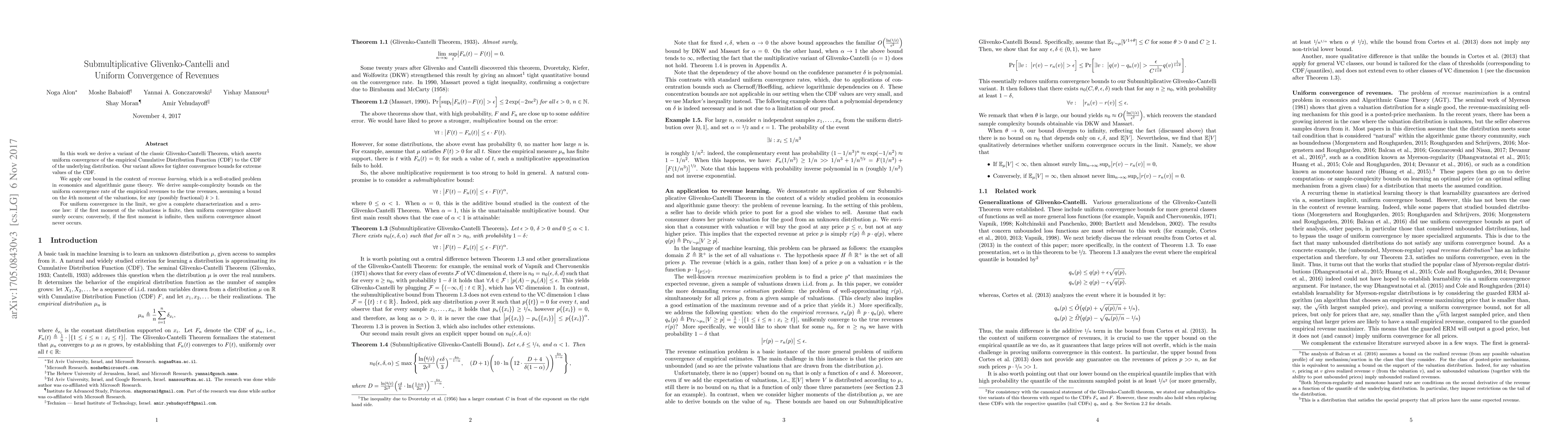 This paper presents a refined version of the Glivenko-Cantelli Theorem with tighter convergence bounds for extreme values, and applies it to revenue learning in economics and algorithmic game theory, deriving sample-complexity bounds for uniform convergence of empirical revenues to true revenues. It also provides a zero-one law for uniform convergence based on the finiteness of the first moment of valuations.
