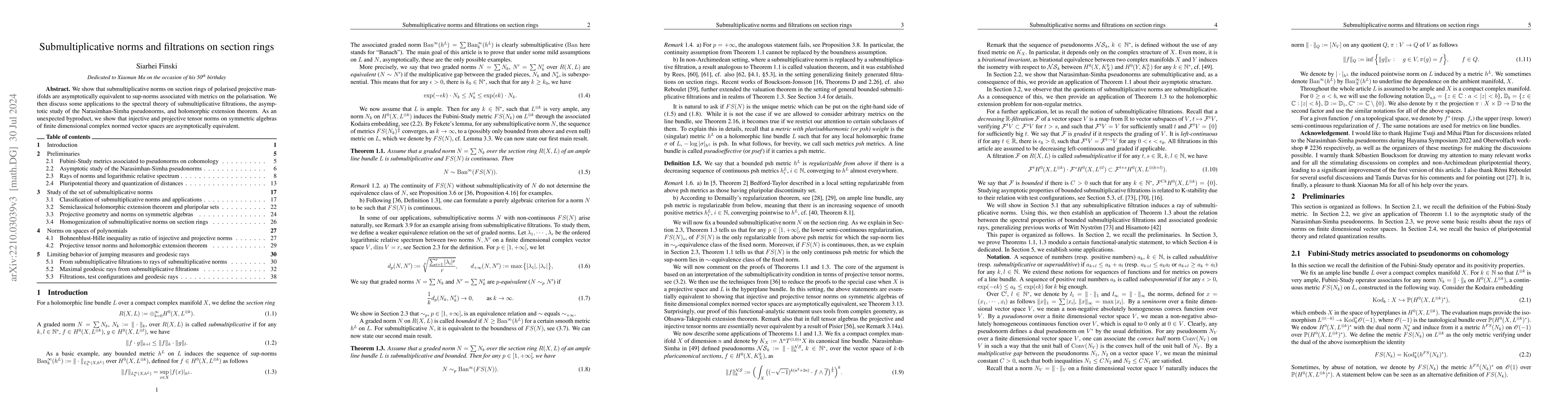 This paper demonstrates the asymptotic equivalence of submultiplicative norms on section rings of polarized projective manifolds to sup-norms linked to metrics on the polarization. It also proves the convergence of jumping measures associated with bounded filtrations to spectral measures of Bergman geodesic rays, and establishes a weak version of the semiclassical holomorphic extension theorem for generic submanifolds. An unexpected result shows the asymptotic equivalence of injective and projective tensor norms on symmetric algebras of complex normed vector spaces.