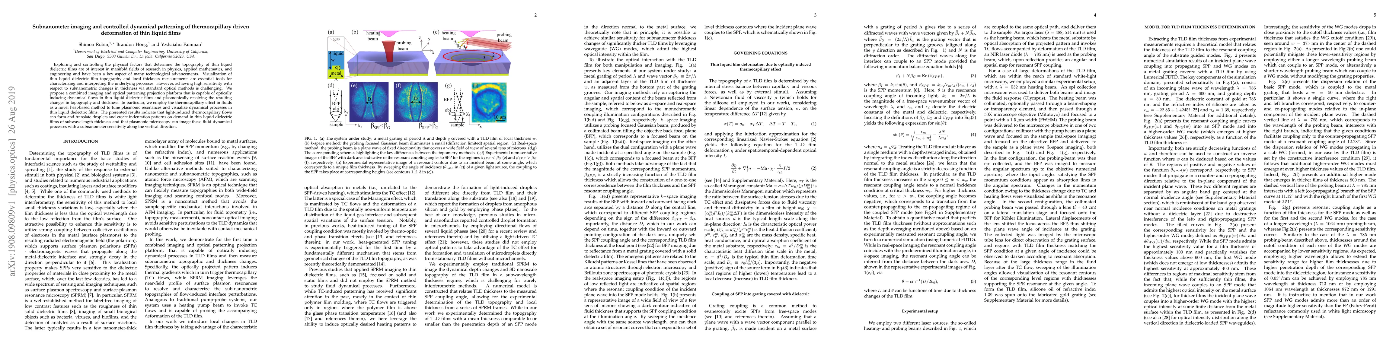 This paper proposes a novel imaging and optical patterning platform to dynamically control and visualize thermocapillary-driven deformations in thin liquid films, achieving subnanometer sensitivity. The method employs light-induced thermocapillary flows to manipulate fluid dynamics and plasmonic microscopy to resolve topographical changes.