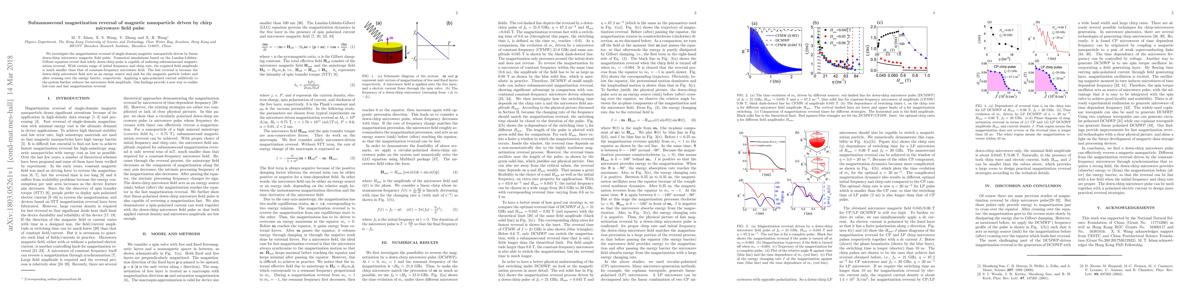 This study reveals that a linear down-chirp microwave field pulse can induce subnanosecond magnetization reversal in single-domain magnetic nanoparticles, requiring significantly lower field amplitude compared to constant-frequency pulses. The addition of a spin-polarized current further reduces the necessary field amplitude, offering a cost-effective method for rapid magnetization control.
