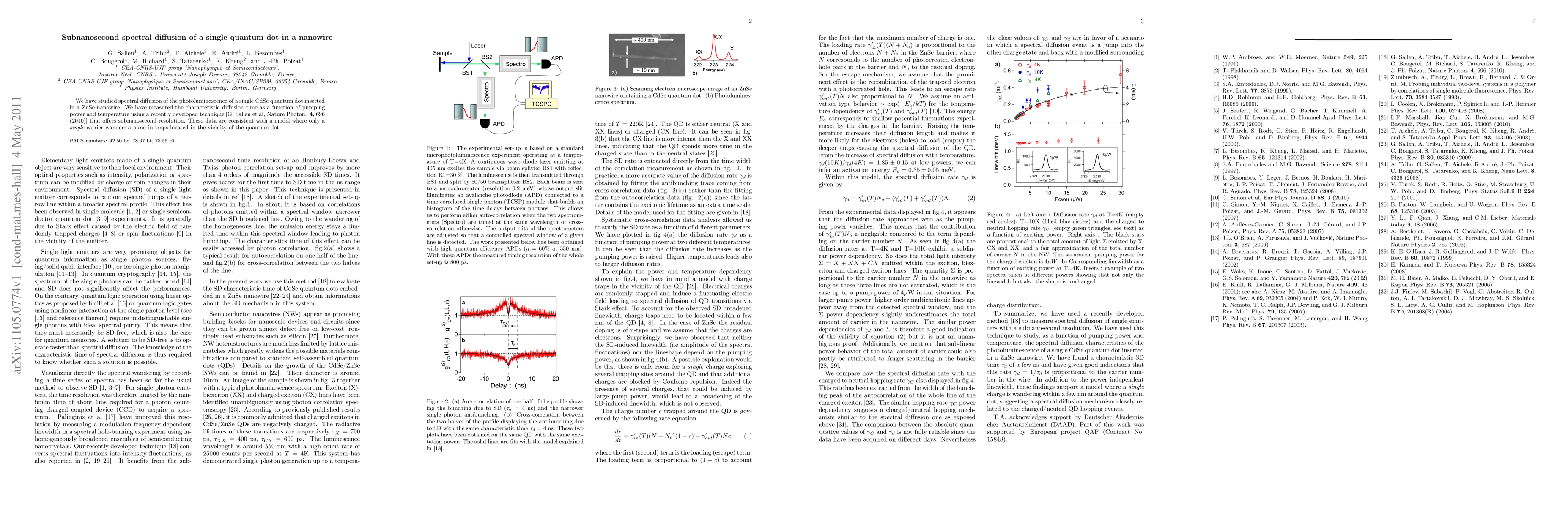 This study investigates the spectral diffusion of a single CdSe quantum dot in a ZnSe nanowire using a subnanosecond resolution technique, revealing that the diffusion time varies with pumping power and temperature, consistent with a model involving a single carrier moving through nearby traps.