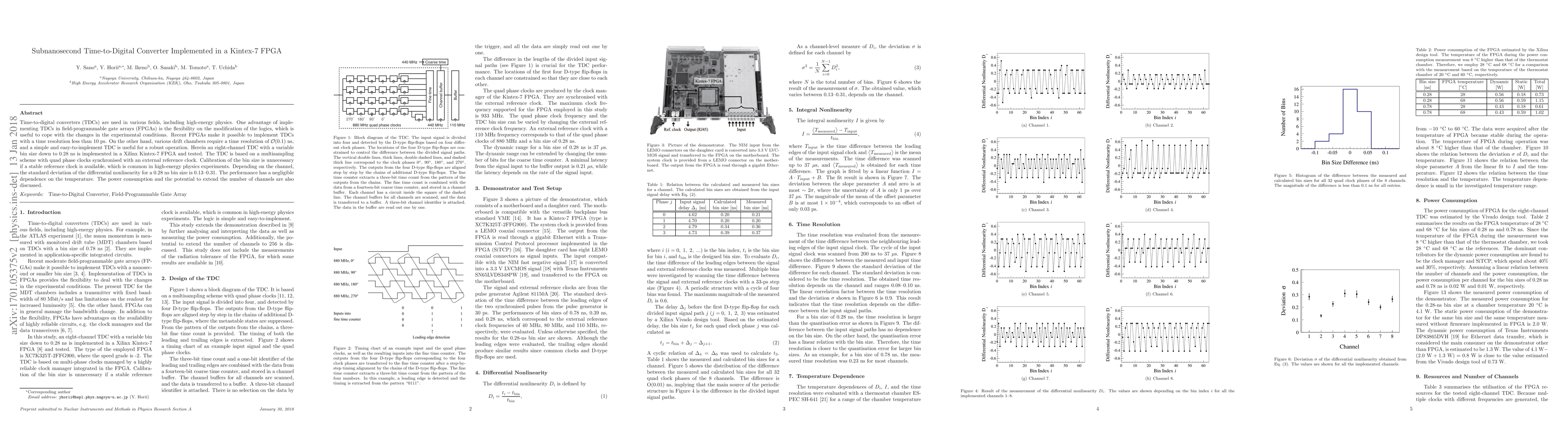 A subnanosecond time-to-digital converter is implemented in a Kintex-7 FPGA with variable bin sizes down to 0.28 ns, offering improved flexibility for drift chambers.