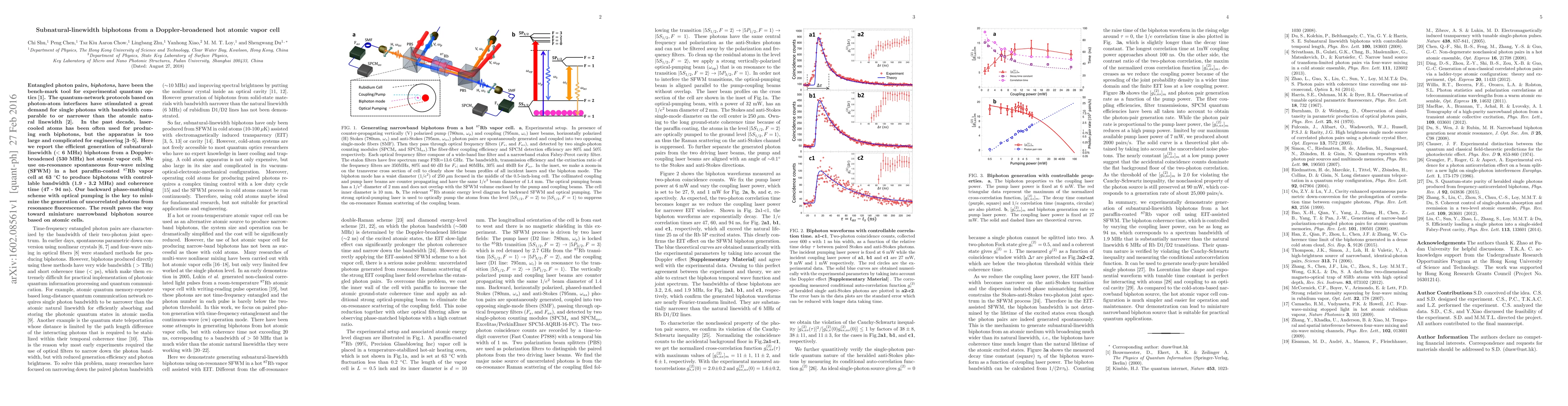 This paper describes the generation of subnatural-linewidth biphotons (<6 MHz) from on-resonance spontaneous four-wave mixing in a Doppler-broadened hot atomic vapor cell, achieving time-frequency entangled photon pairs with a bandwidth of 1.9-3.2 MHz and coherence time of 47-94 ns. The method uses a backward phase-matching scheme to minimize uncorrelated photon generation.