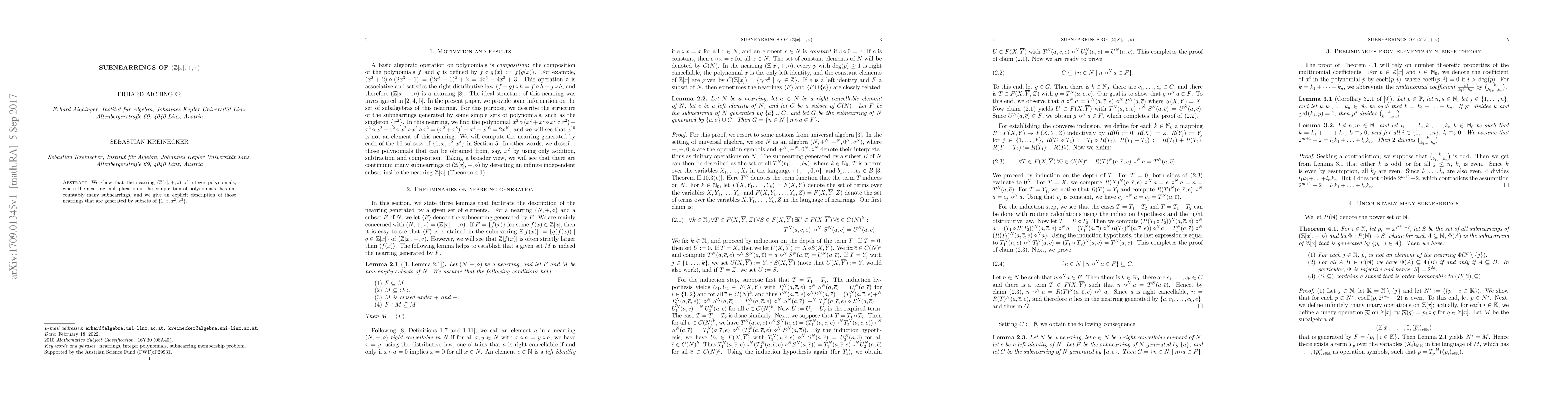 This paper demonstrates that the nearring $(\mathbb{Z}[x],+,\circ)$, with polynomial composition as the nearring multiplication, contains uncountably many subnearrings. It also provides a detailed description of subnearrings generated by subsets of $\{1, x, x^2, x^3\}$.