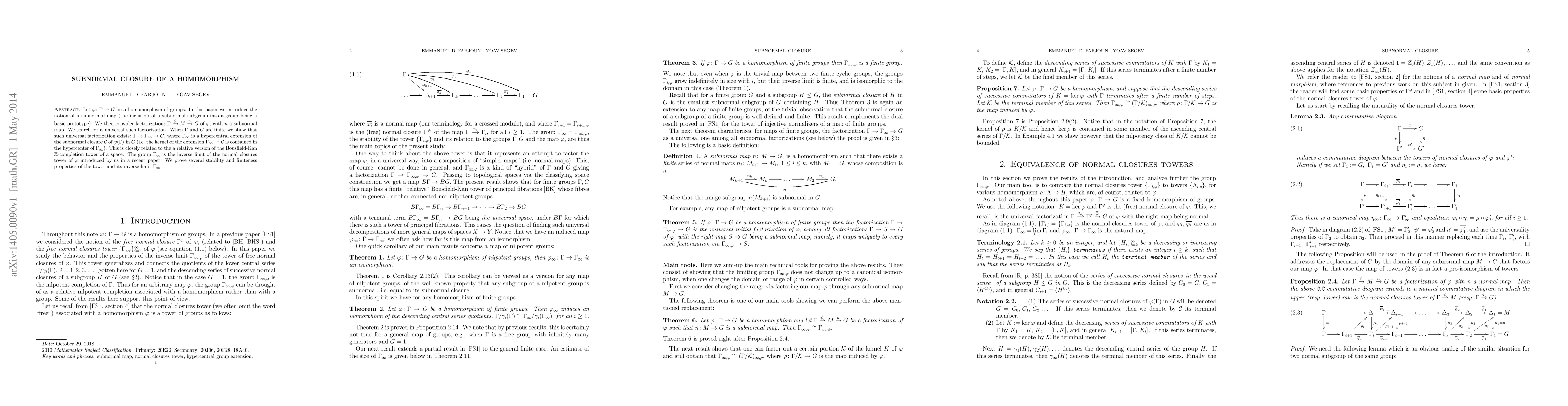 Let $\varphi\colon\Gamma\to G$ be a homomorphism of groups. In this paper we introduce the notion of a subnormal map (the inclusion of a subnormal subgroup into a group being a basic prototype). We then consider factorizations $\Gamma\xrightarrow{\psi} M\xrightarrow{n} G$ of $\varphi,$ with $n$ a subnormal map. We search for a universal such factorization. When $\Gamma$ and $G$ are finite we show that such universal factorization exists: $\Gamma\to\Gamma_{\infty}\to G,$ where $\Gamma_{\infty}$ is a hypercentral extension of the subnormal closure $\mathcal{C}$ of $\varphi(\Gamma)$ in $G$ (i.e.~the kernel of the extension $\Gamma_{\infty}\to {\mathcal C}$ is contained in the hypercenter of $\Gamma_{\infty}$). This is closely related to the a relative version of the Bousfield-Kan $\mathbb{Z}$-completion tower of a space. The group $\Gamma_{\infty}$ is the inverse limit of the normal closures tower of $\varphi$ introduced by us in a recent paper. We prove several stability and finiteness properties of the tower and its inverse limit $\Gamma_{\infty}$.