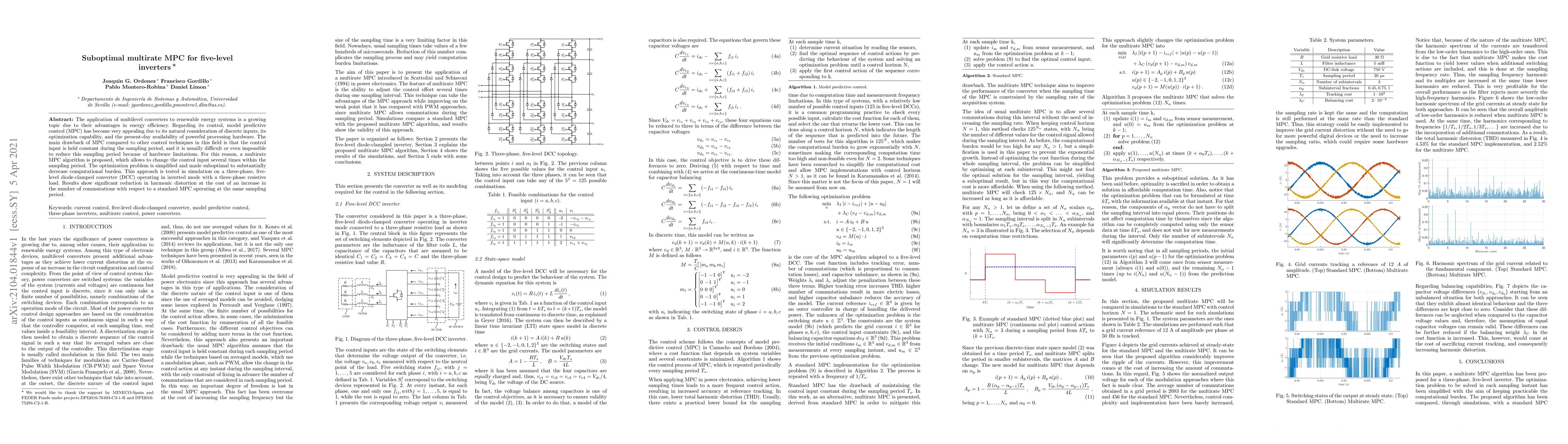 This paper proposes a suboptimal multirate model predictive control (MPC) algorithm for five-level inverters used in renewable energy systems, aiming to reduce computational burden while maintaining control efficiency. Simulation results on a three-phase five-level diode-clamped converter show reduced harmonic distortion but increased commutations.