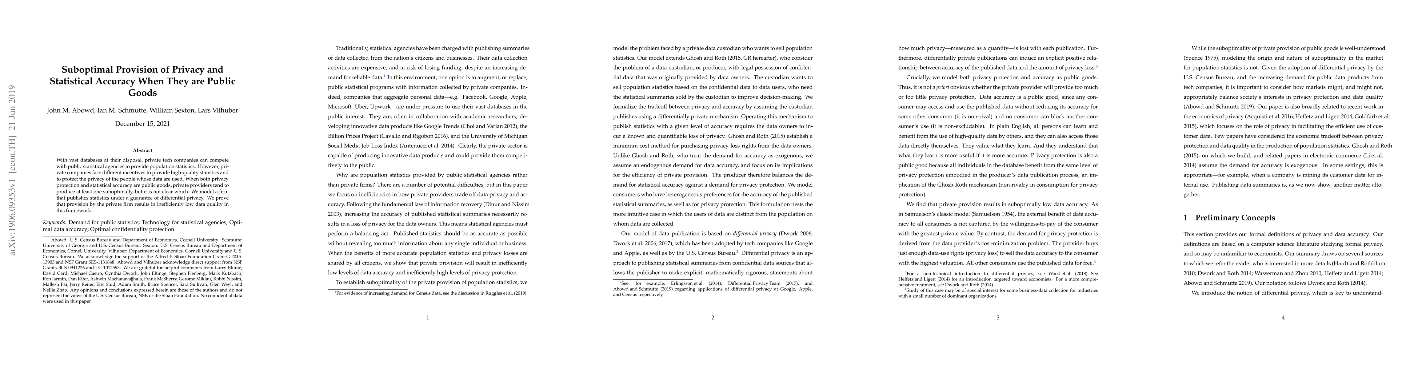 A private tech firm that provides statistics under a guarantee of differential privacy tends to produce low data quality, compromising both statistical accuracy and individual privacy. This inefficiency occurs when both are public goods, highlighting the need for new approaches to balance competing interests in data collection and analysis.