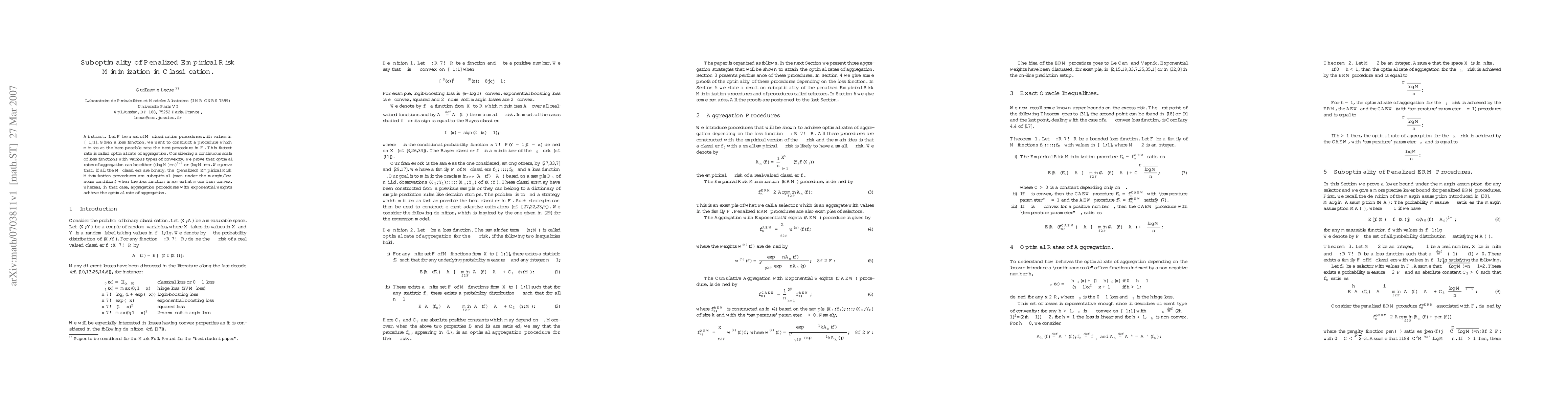 Let $\cF$ be a set of $M$ classification procedures with values in $[-1,1]$. Given a loss function, we want to construct a procedure which mimics at the best possible rate the best procedure in $\cF$. This fastest rate is called optimal rate of aggregation. Considering a continuous scale of loss functions with various types of convexity, we prove that optimal rates of aggregation can be either $((\log M)/n)^{1/2}$ or $(\log M)/n$. We prove that, if all the $M$ classifiers are binary, the (penalized) Empirical Risk Minimization procedures are suboptimal (even under the margin/low noise condition) when the loss function is somewhat more than convex, whereas, in that case, aggregation procedures with exponential weights achieve the optimal rate of aggregation.