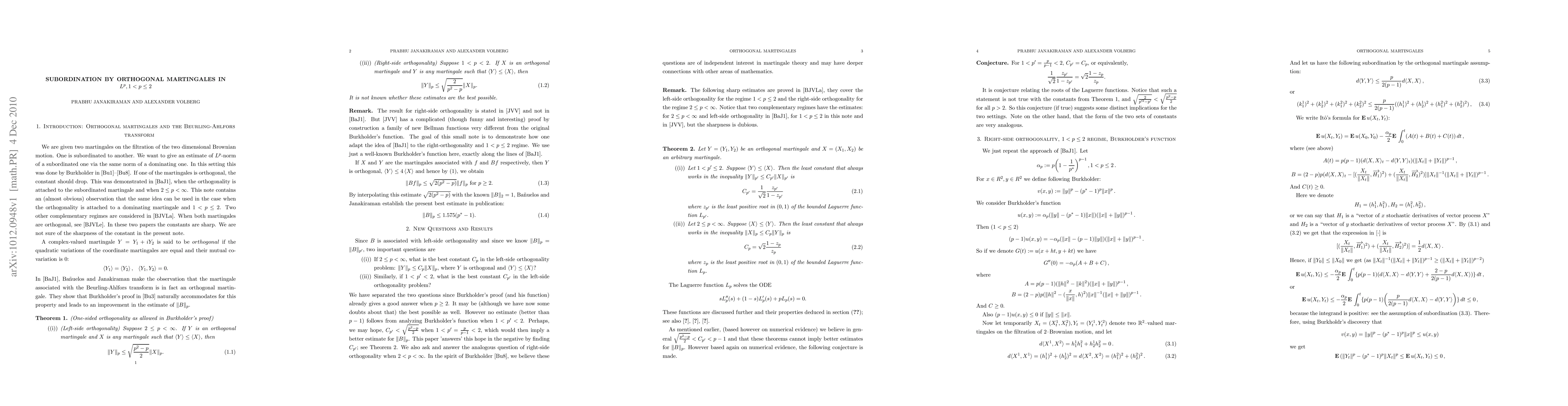 We are given two martingales on the filtration of the two dimensional Brownian motion. One is subordinated to another. We want to give an estimate of $L^p$-norm of a subordinated one via the same norm of a dominating one. In this setting this was done by Burkholder in \cite{Bu1}--\cite{Bu8}. If one of the martingales is orthogonal, the constant should drop. This was demonstrated in \cite{BaJ1}, when the orthogonality is attached to the subordinated martingale and when $2\le p<\infty$. This note contains an (almost obvious) observation that the same idea can be used in the case when the orthogonality is attached to a dominating martingale and $1