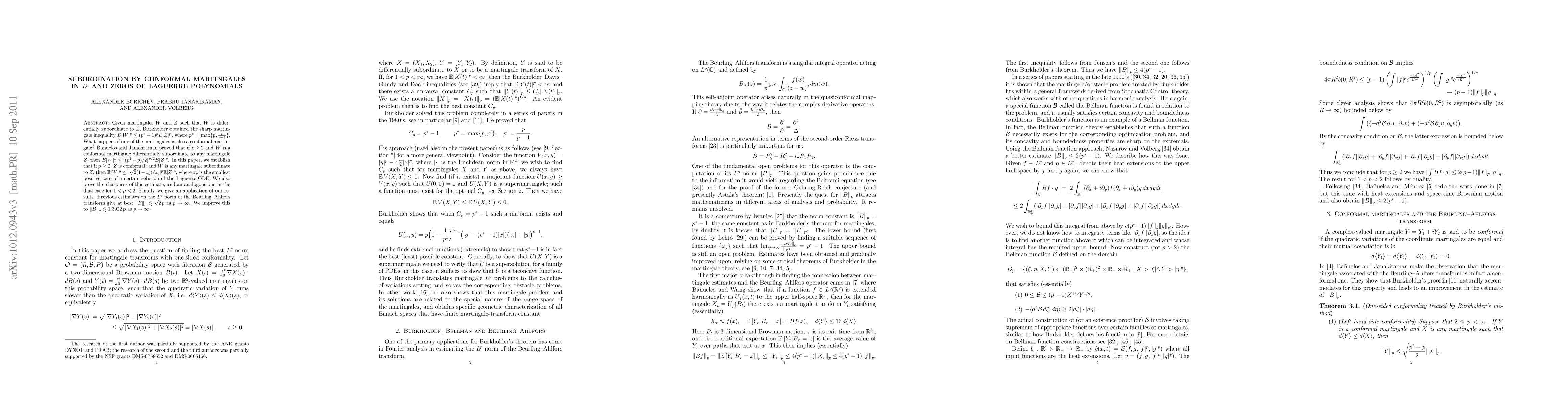 2$, but the orthogonal martingale is a subordinator. The answers are given in terms of zeros of Laguerre polynomials. As an application of our sharp constant we obtain a new estimate for the norm of theAhlfors--Beurling operator. We estimate it as $1.3922(p-1)$ asymptotically for large $p$.