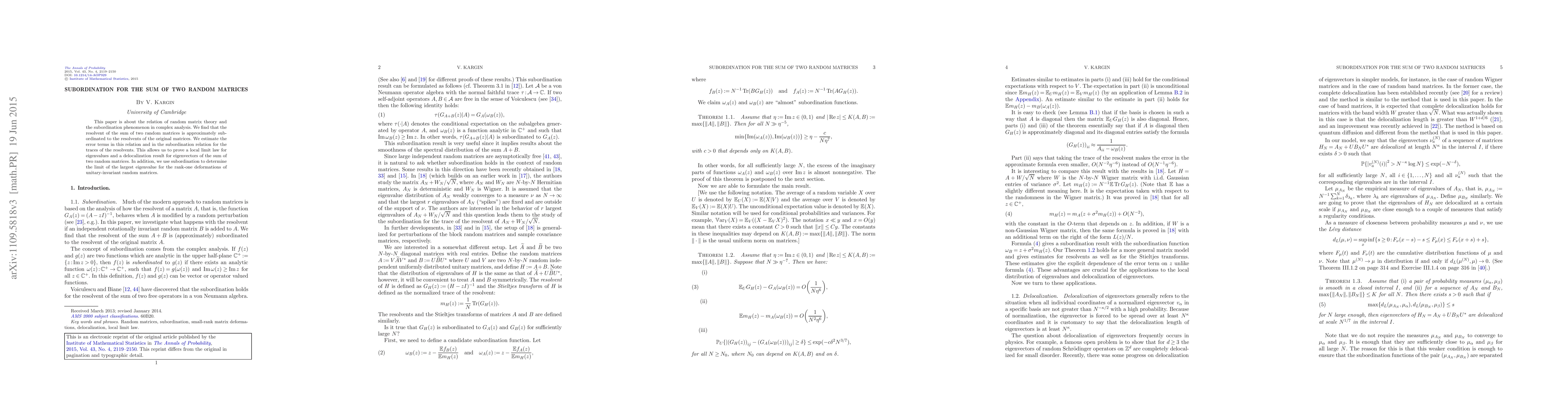 Researchers found that the resolvent of two random matrices combined is approximately subordinated to their individual resolvents, leading to results on eigenvalues and eigenvectors.