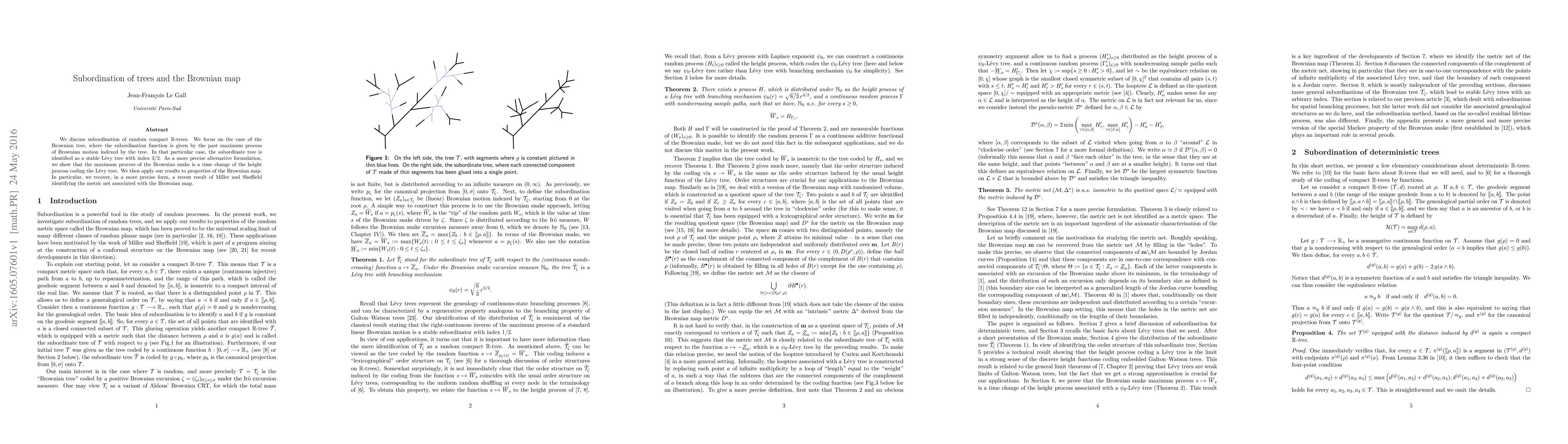 This paper explores the subordination of random compact R-trees, particularly the Brownian tree, where the subordination function is the past maximum process of Brownian motion. The subordinate tree is identified as a stable Lévy tree with index 3/2, and the maximum process of the Brownian snake is shown to be a time change of the height process coding the Lévy tree. The results are applied to the properties of the Brownian map, refining a recent result on the metric net associated with it.