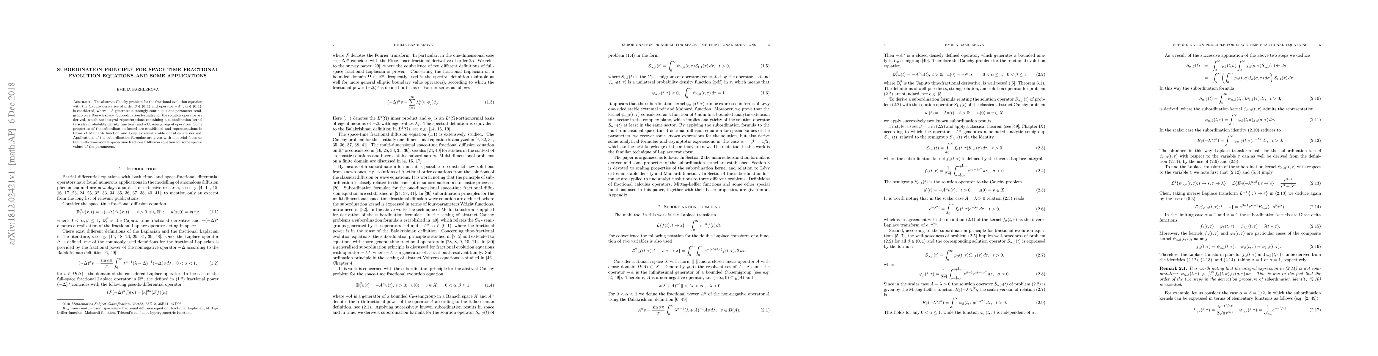 The abstract Cauchy problem for the fractional evolution equation with the Caputo derivative of order $\beta\in(0,1)$ and operator $-A^\alpha$, $\alpha\in(0,1)$, is considered, where $-A$ generates a strongly continuous one-parameter semigroup on a Banach space. Subordination formulae for the solution operator are derived, which are integral representations containing a subordination kernel (a scalar probability density function) and a $C_0$-semigroup of operators. Some properties of the subordination kernel are established and representations in terms of Mainardi function and L\'evy extremal stable densities are derived. Applications of the subordination formulae are given with a special focus on the multi-dimensional space-time fractional diffusion equation for some special values of the parameters.