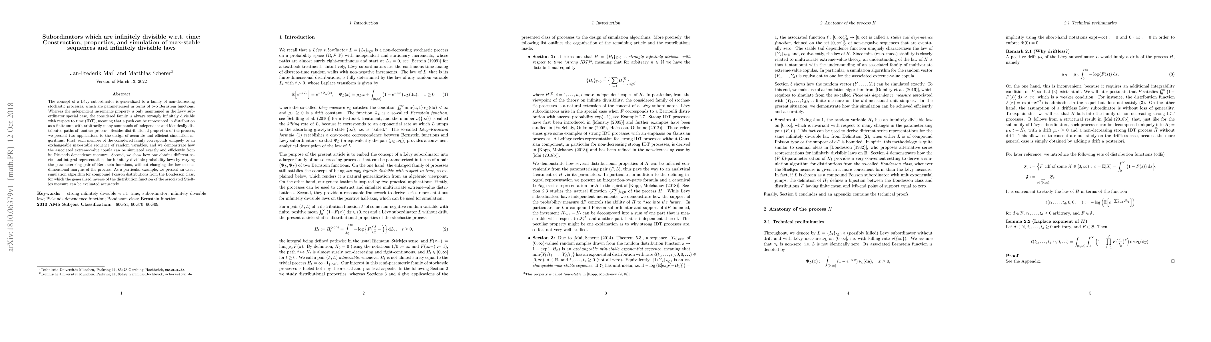 The concept of a L\'evy subordinator is generalized to a family of non-decreasing stochastic processes, which are parameterized in terms of two Bernstein functions. Whereas the independent increments property is only maintained in the L\'evy subordinator special case, the considered family is always strongly infinitely divisible with respect to time, meaning that a path can be represented in distribution as a finite sum with arbitrarily many summands of independent and identically distributed paths of another process. Besides distributional properties of the process, we present two applications to the design of accurate and efficient simulation algorithms. First, each member of the considered family corresponds uniquely to an exchangeable max-stable sequence of random variables, and we demonstrate how the associated extreme-value copula can be simulated exactly and efficiently from its Pickands dependence measure. Second, we show how one obtains different series and integral representations for infinitely divisible probability laws by varying the parameterizing pair of Bernstein functions, without changing the law of one-dimensional margins of the process. As a particular example, we present an exact simulation algorithm for compound Poisson distributions from the Bondesson class, for which the generalized inverse of the distribution function of the associated Stieltjes measure can be evaluated accurately.
