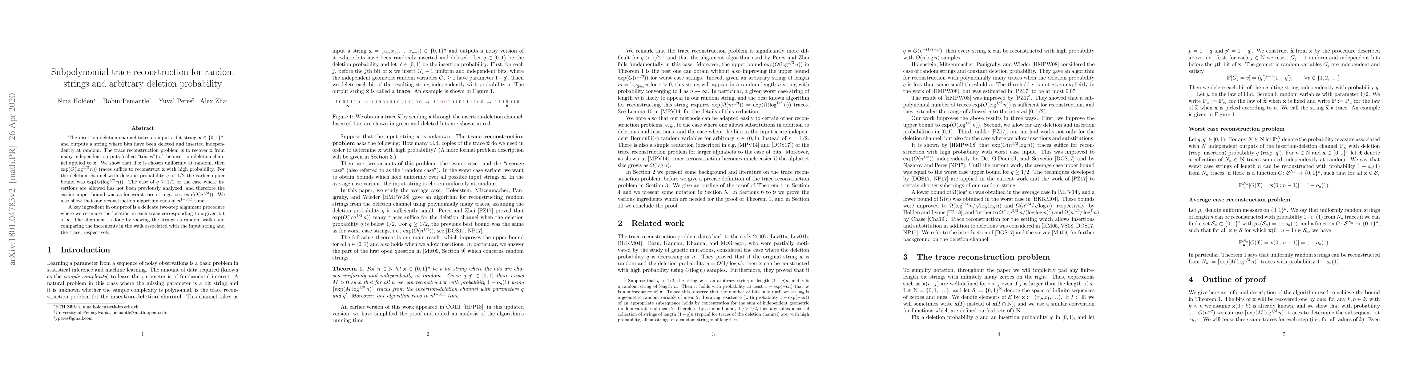 This paper presents a method for reconstructing random bit strings from traces generated by an insertion-deletion channel, showing that $\exp(O(\log^{1/3} n))$ traces are sufficient for high probability reconstruction. It improves previous bounds for deletion probabilities below $1/2$ and extends analysis to cases where deletion probability is $1/2$ or higher, or where insertions are allowed.
