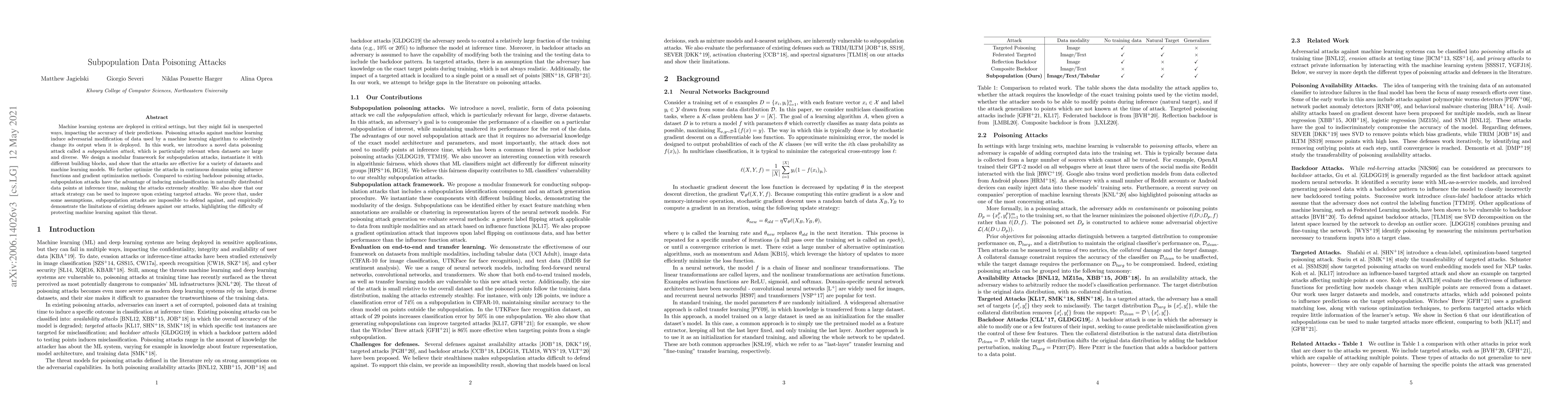 This paper introduces a novel "subpopulation attack" method for poisoning machine learning models, which selectively alters data to misclassify specific subsets of data points. The authors demonstrate the effectiveness of this stealthy attack across various datasets and models, showing that it is difficult to defend against compared to traditional backdoor attacks.