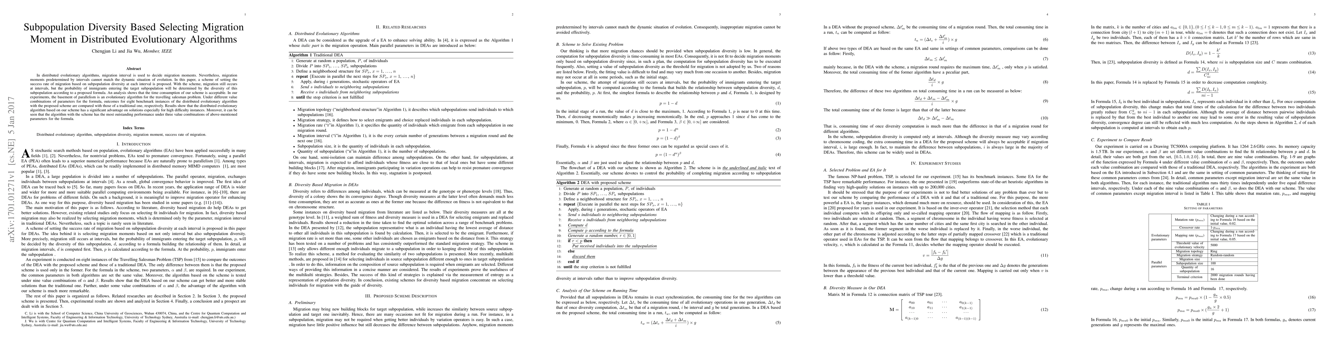 This paper proposes a scheme to dynamically adjust migration moments in distributed evolutionary algorithms based on subpopulation diversity, improving solution quality, especially for complex instances. Experimental results show significant advantages over traditional methods for the traveling salesman problem.