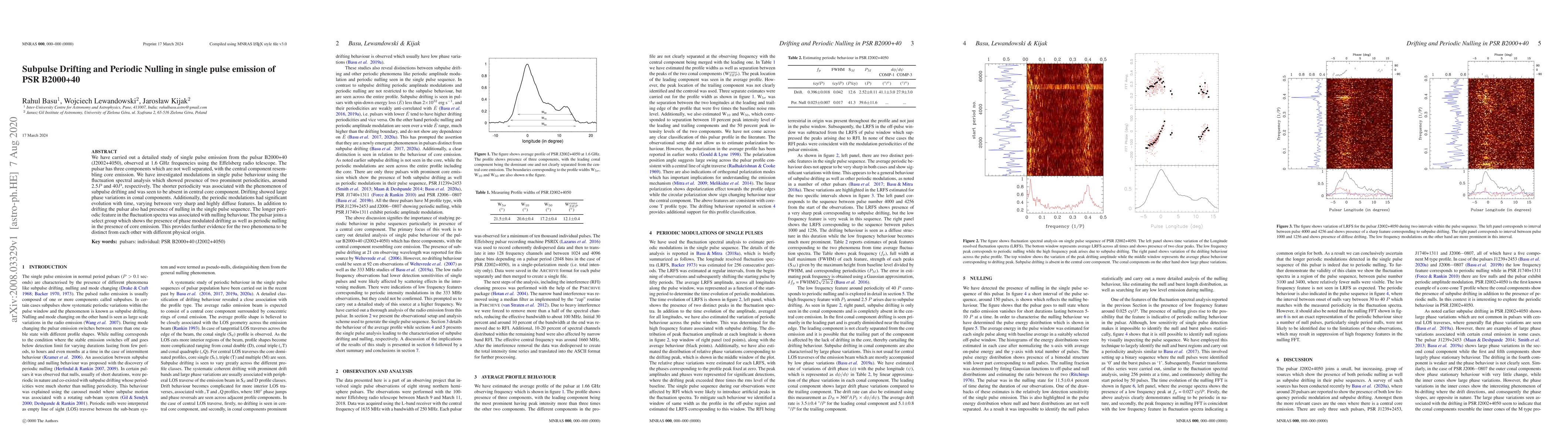 The study of pulsar B2000+40 at 1.6 GHz revealed two periodicities in single pulse emission: 2.5P (subpulse drifting) and 40P (nulling), distinct from core emission. The findings suggest these phenomena have different physical origins, observed using Effelsberg radio telescope and fluctuation spectral analysis.