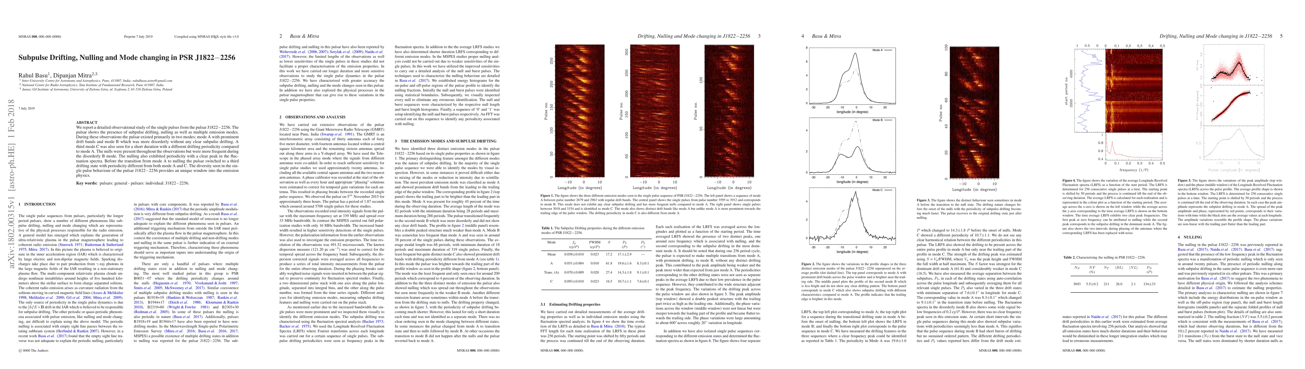 This study investigates the single pulses of pulsar J1822$-$2256, revealing subpulse drifting, nulling, and multiple emission modes. The pulsar primarily alternates between orderly mode A with drift bands and disorderly mode B, with a brief appearance of mode C. Nulling events are more frequent in mode B and show periodic fluctuations.