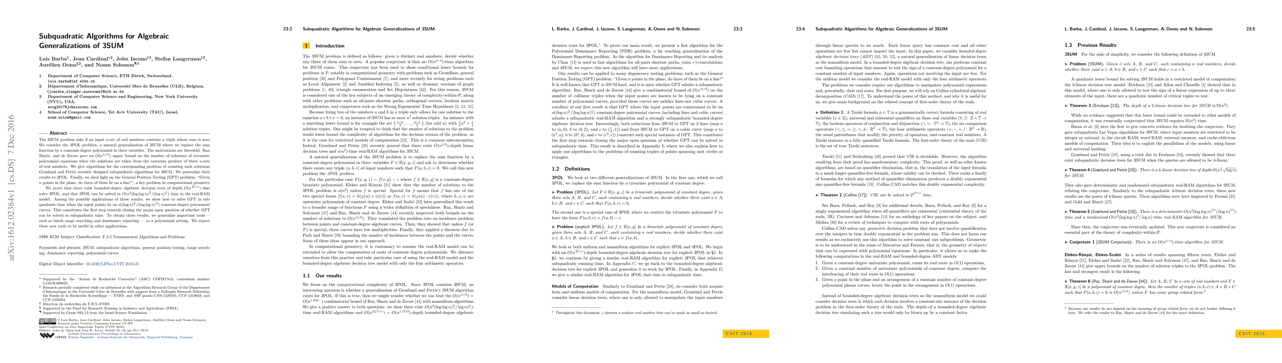 This paper presents subquadratic algorithms for the 3POL problem, a polynomial generalization of the 3SUM problem, achieving a time complexity of $O(n^2 {(\log \log n)}^\frac{3}{2} / {(\log n)}^\frac{1}{2})$ in the real-RAM model. It also explores applications to the General Position Testing (GPT) problem in computational geometry, showing subquadratic solutions under certain conditions.