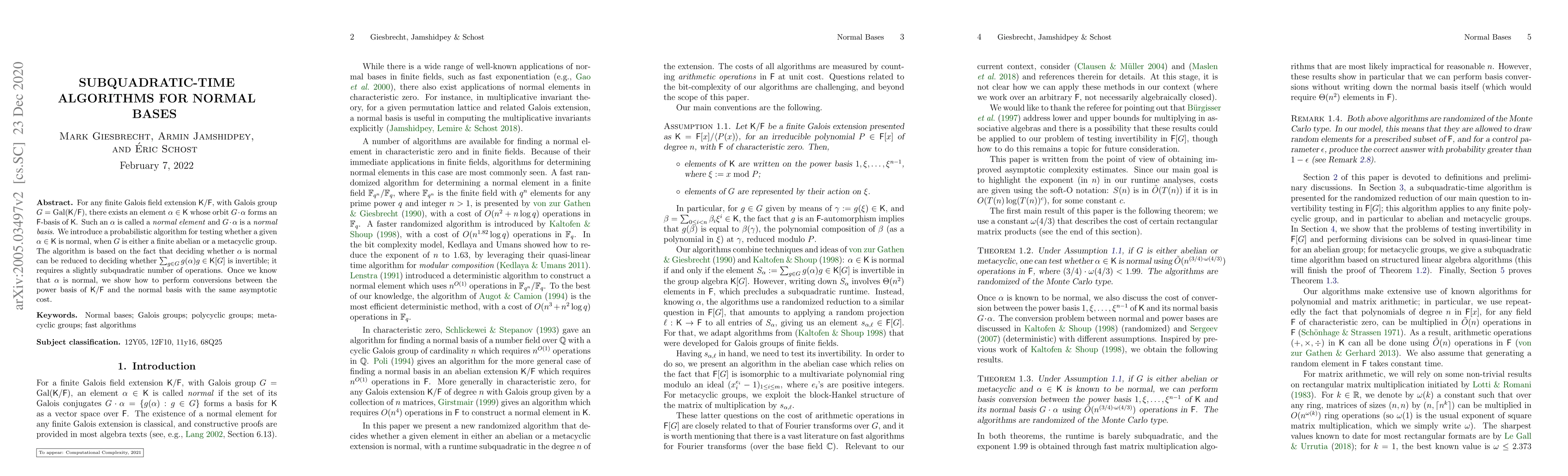 For any finite Galois field extension $\mathsf{K}/\mathsf{F}$, with Galois group $G = \mathrm{Gal}(\mathsf{K}/\mathsf{F})$, there exists an element $\alpha \in \mathsf{K}$ whose orbit $G\cdot\alpha$ forms an $\mathsf{F}$-basis of $\mathsf{K}$. Such a $\alpha$ is called a normal element and $G\cdot\alpha$ is a normal basis. We introduce a probabilistic algorithm for testing whether a given $\alpha \in \mathsf{K}$ is normal, when $G$ is either a finite abelian or a metacyclic group. The algorithm is based on the fact that deciding whether $\alpha$ is normal can be reduced to deciding whether $\sum_{g \in G} g(\alpha)g \in \mathsf{K}[G]$ is invertible; it requires a slightly subquadratic number of operations. Once we know that $\alpha$ is normal, we show how to perform conversions between the power basis of $\mathsf{K}/\mathsf{F}$ and the normal basis with the same asymptotic cost.