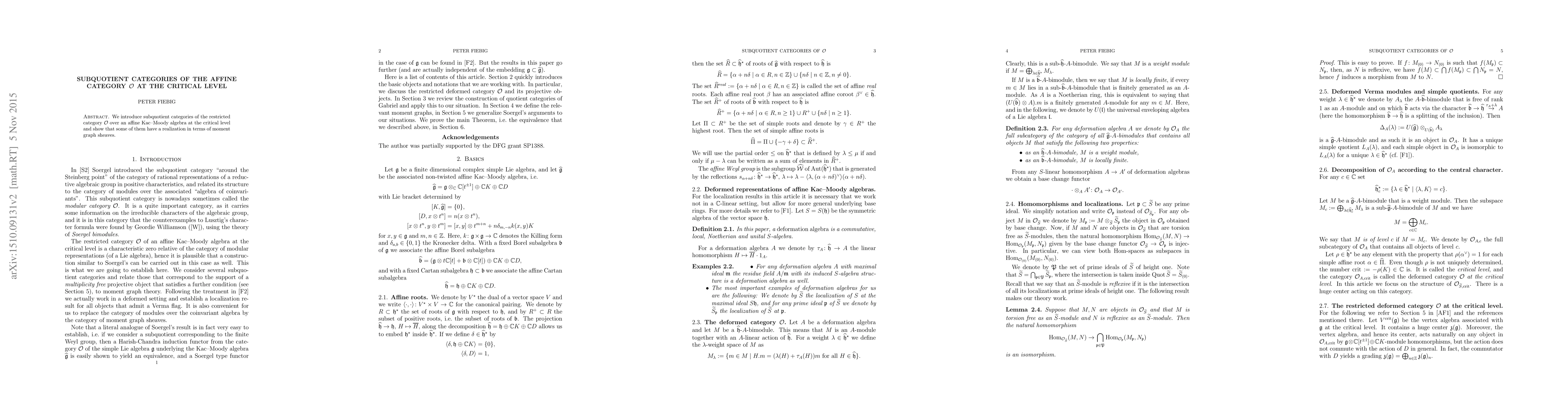 We introduce subquotient categories of the restricted affine category O at the critical level and show that some of them have a realization in terms of moment graph sheaves.