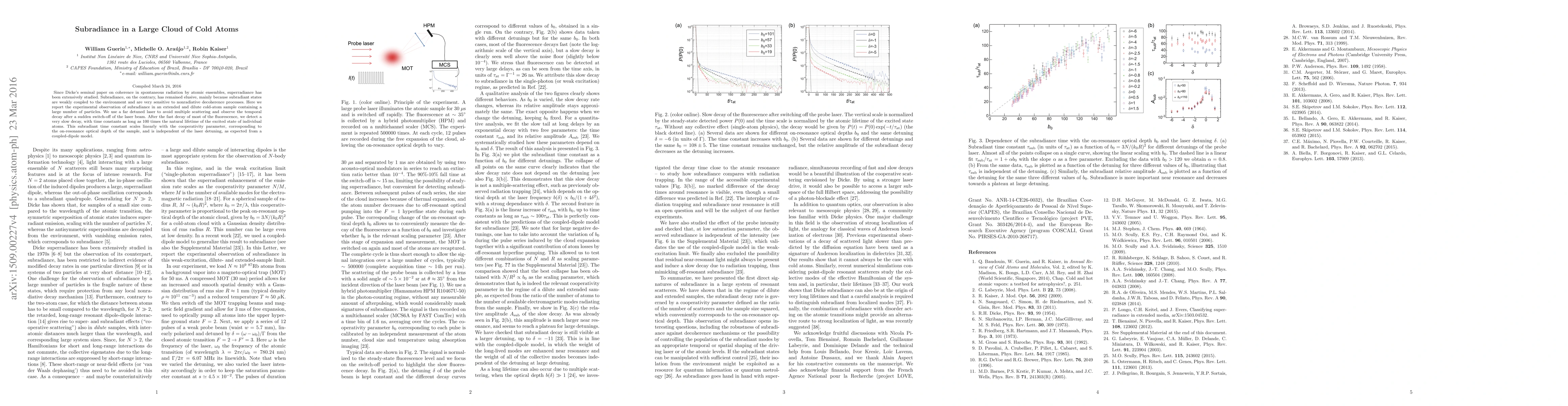 This paper reports the experimental observation of subradiance in a large cloud of cold atoms, demonstrating a slow decay process 100 times longer than the natural atomic lifetime. The observed subradiant time constant scales linearly with the cooperativity parameter and remains unaffected by laser detuning, confirming theoretical predictions from a coupled-dipole model.