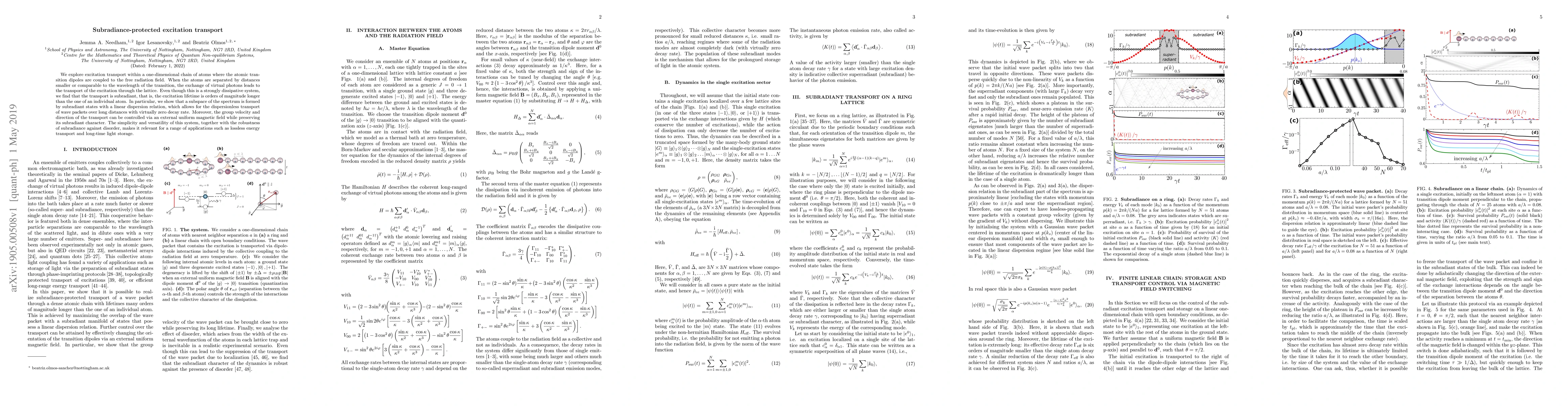 This paper investigates excitation transport in a one-dimensional atomic chain where atoms exhibit subradiant behavior due to virtual photon exchange, leading to long-lived excitations and dispersionless wave packet transport. The transport's direction and velocity can be manipulated by an external magnetic field, highlighting potential applications in lossless energy transport and light storage.