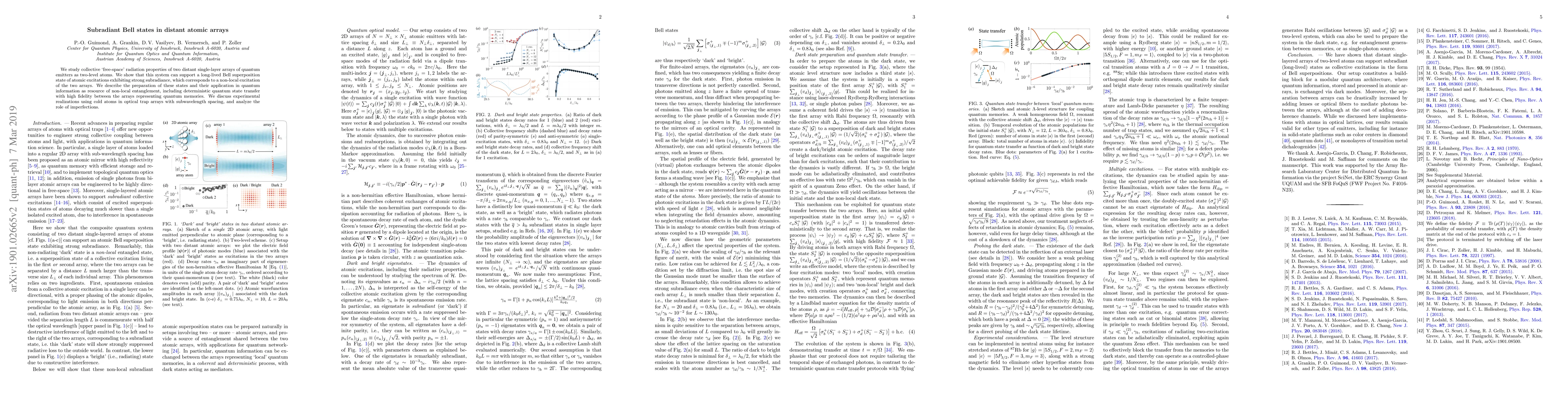 This paper investigates the collective radiation properties of distant atomic arrays, revealing the potential for long-lived subradiant Bell states that exhibit strong subradiance. These states enable high-fidelity quantum state transfer and serve as a resource for non-local entanglement in quantum information applications.