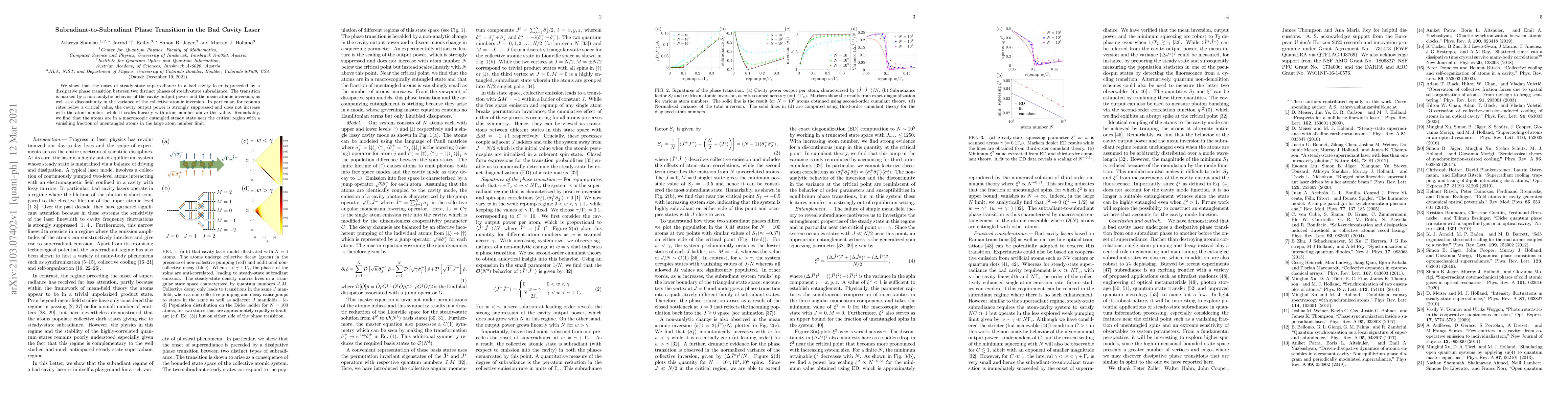 This research identifies a dissipative phase transition in a bad cavity laser, revealing two subradiant phases with distinct steady-state characteristics. The transition is marked by non-analytic behavior in cavity output power and atomic inversion, and discontinuity in atomic inversion variance. Below a critical repump rate, output power remains suppressed with atom number, while above it, power scales linearly. Near the critical region, atoms form a macroscopic entangled state with negligible unentangled atoms as atom number increases.