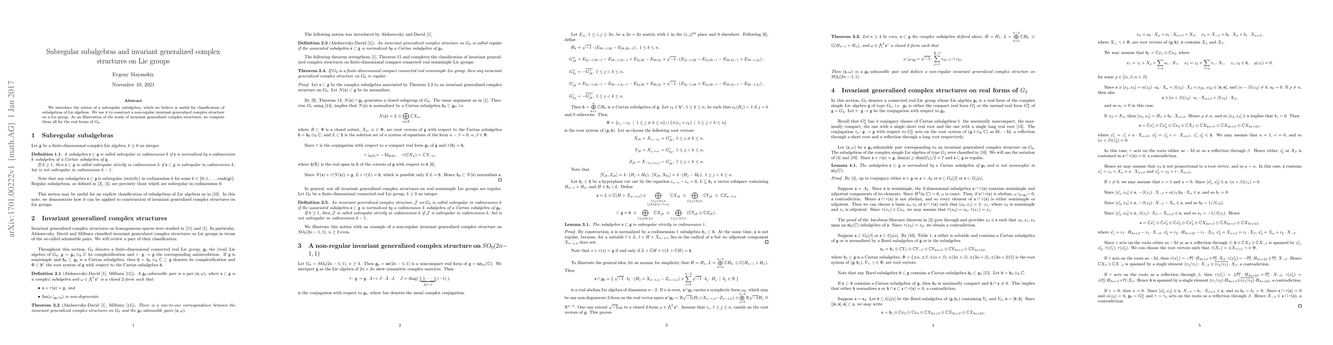 We introduce the notion of a subregular subalgebra, which we believe is useful for classification of subalgebras of Lie algebras. We use it to construct a non-regular invariant generalized complex structure on a Lie group. As an illustration of the study of invariant generalized complex structures, we compute them all for the real forms of G2.