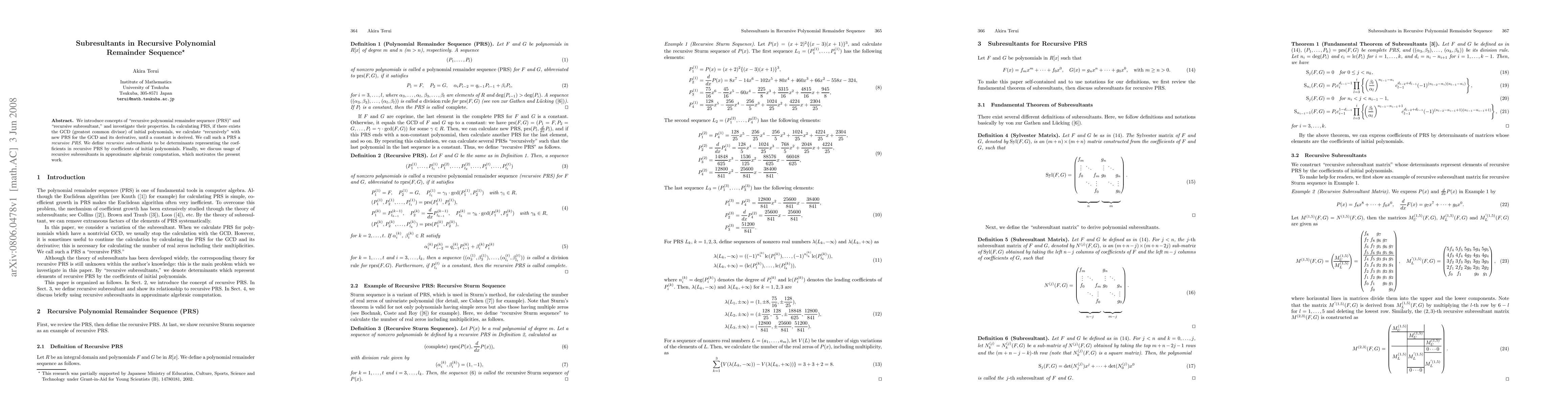 This paper introduces recursive polynomial remainder sequences and recursive subresultants, exploring their properties and applications in approximate algebraic computation. The authors define recursive subresultants as determinants representing coefficients in these sequences, derived from initial polynomials and their GCD.