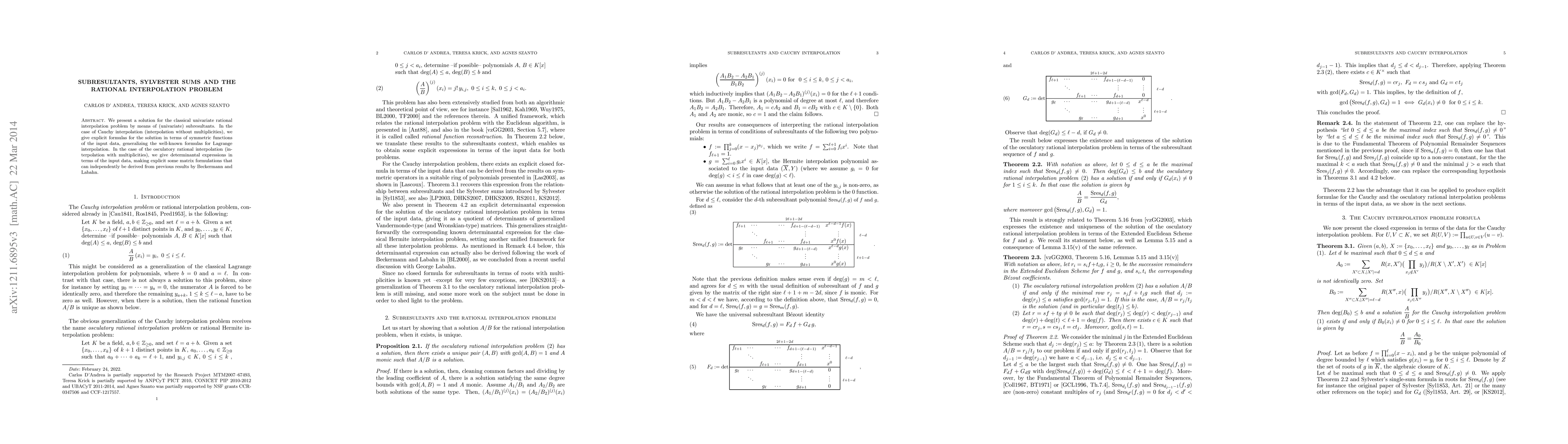 This paper solves the univariate rational interpolation problem using subresultants, providing explicit formulas for Cauchy interpolation and determinantal expressions for osculatory interpolation, generalizing Lagrange interpolation and clarifying matrix formulations from previous work.