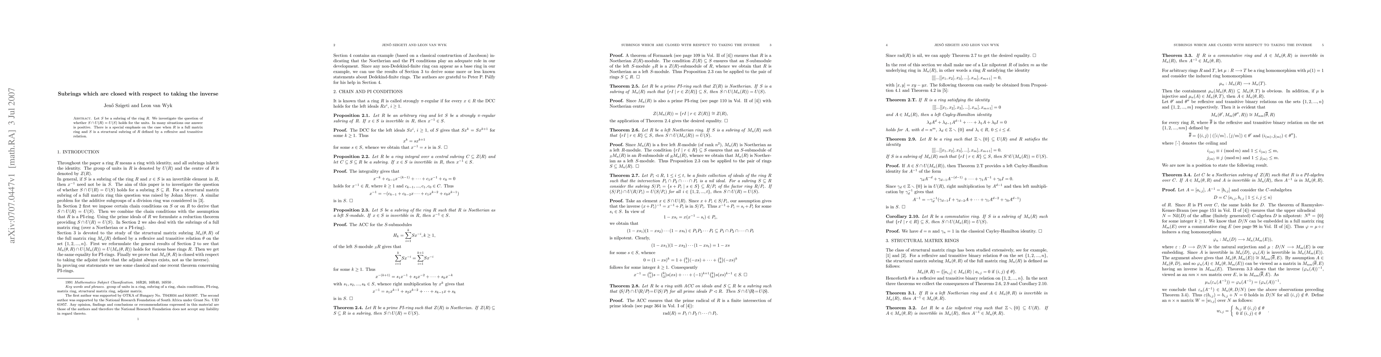 Let S be a subring of the ring R. We investigate the question of whether S intersected by U(R) is equal to U(S) holds for the units. In many situations our answer is positive. There is a special emphasis on the case when R is a full matrix ring and S is a structural subring of R defined by a reflexive and transitive relation.