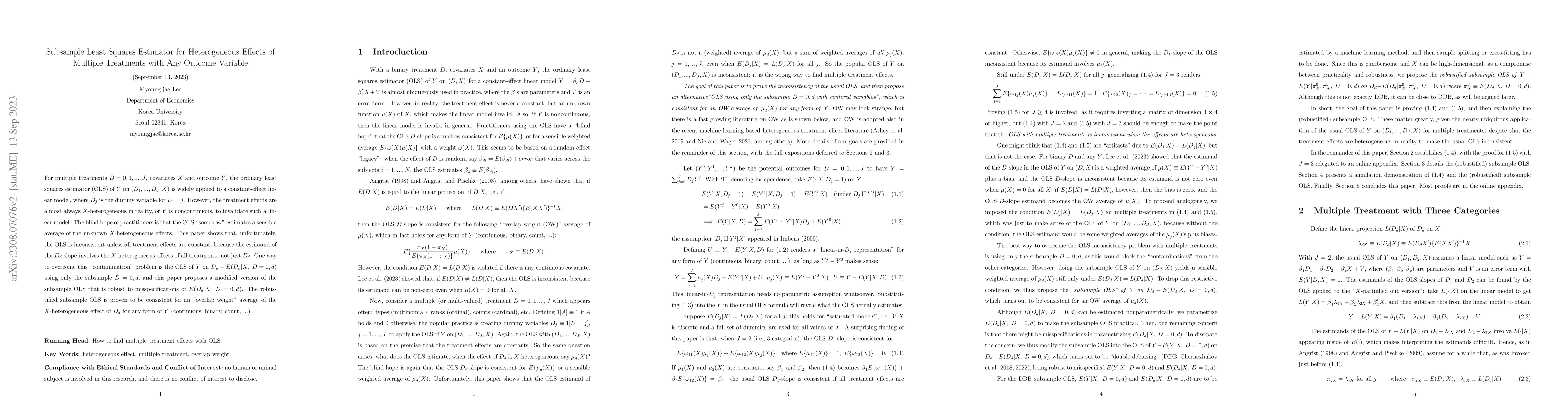 For multiple treatments D=0,1,...,J, covariates X and outcome Y, the ordinary least squares estimator (OLS) of Y on (D1,...,DJ,X) is widely applied to a constant-effect linear model, where Dj is the dummy variable for D=j. However, the treatment effects are almost always X-heterogeneous in reality, or Y is noncontinuous, to invalidate such a linear model. The blind hope of practitioners is that the OLS "somehow" estimates a sensible average of the unknown X-heterogeneous effects. This paper shows that, unfortunately, the OLS is inconsistent unless all treatment effects are constant, because the estimand of the Dd-slope involves the X-heterogeneous effects of all treatments, not just Dd. One way to overcome this "contamination" problem is the OLS of Y on Dd-E(Dd|X, D=0,d) using only the subsample D=0,d, and this paper proposes a modified version of the subsample OLS that is robust to misspecifications of E(Dd|X, D=0,d). The robustified subsample OLS is proven to be consistent for an "overlap weight" average of the X-heterogeneous effect of Dd for any form of Y (continuous, binary, count, ...).