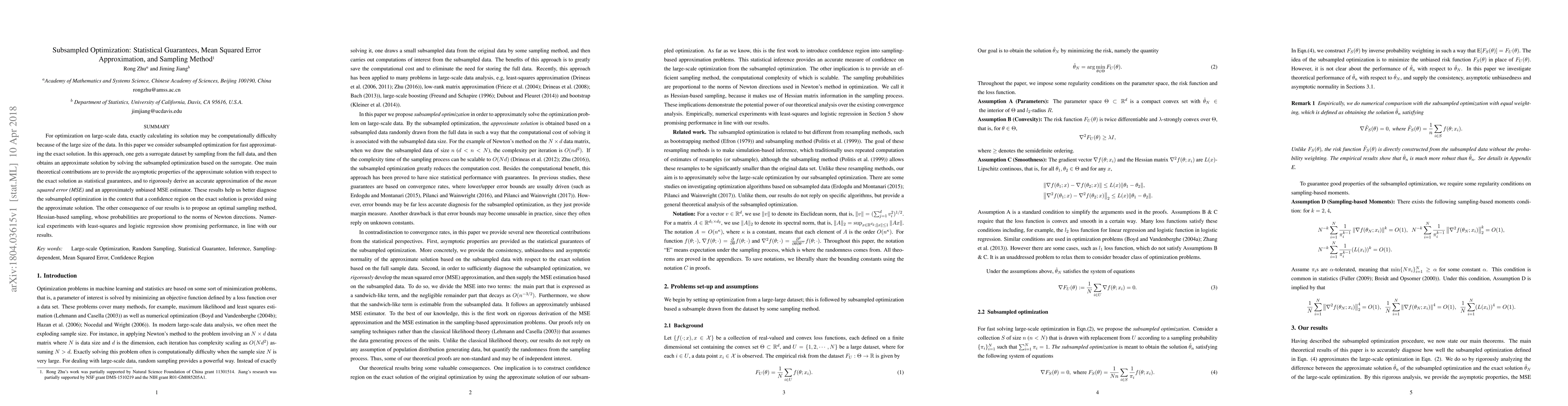 This paper presents subsampled optimization as a method to approximate exact solutions for large-scale data, providing statistical guarantees, an accurate approximation of mean squared error, and an optimal sampling method.