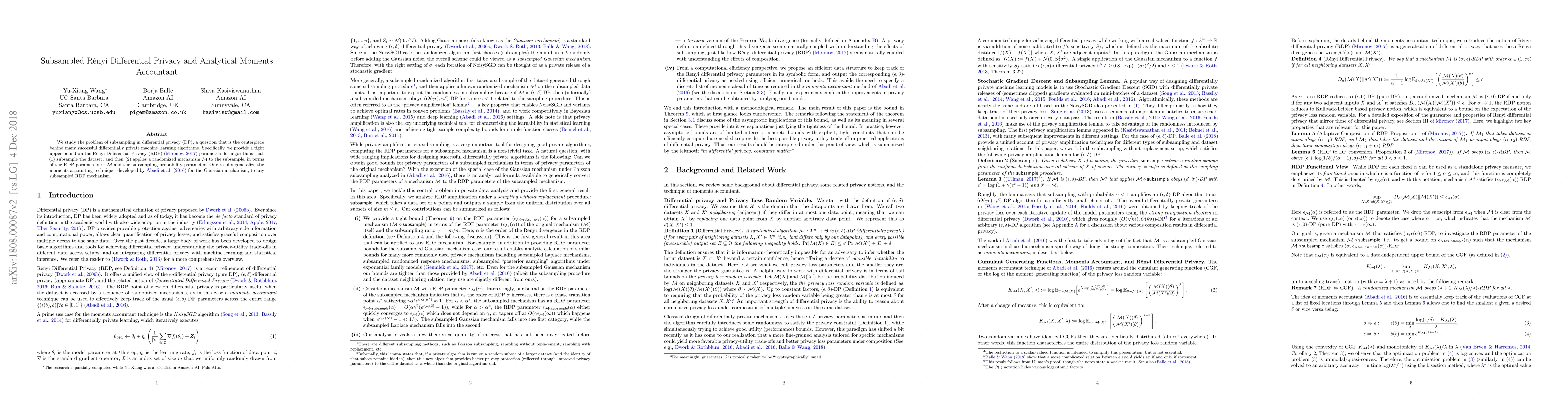 This paper investigates subsampling in differential privacy, providing a tight upper bound on Rényi Differential Privacy parameters for algorithms that subsample datasets and apply a randomized mechanism. The results generalize the moments accountant technique to any subsampled Rényi Differential Privacy mechanism.