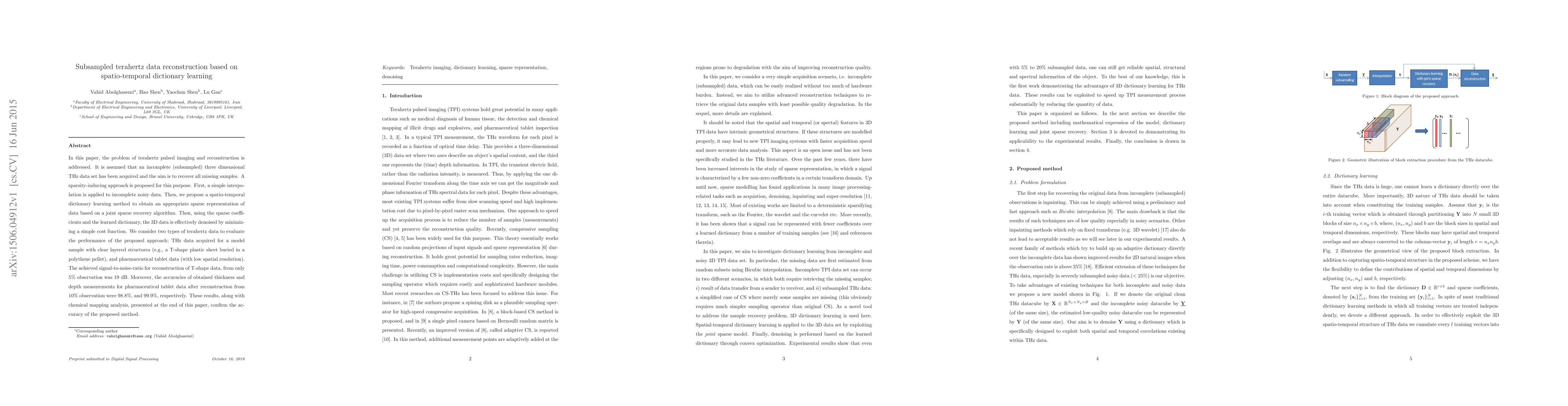 In this paper, the problem of terahertz pulsed imaging and reconstruction is addressed. It is assumed that an incomplete (subsampled) three dimensional THz data set has been acquired and the aim is to recover all missing samples. A sparsity-inducing approach is proposed for this purpose. First, a simple interpolation is applied to incomplete noisy data. Then, we propose a spatio-temporal dictionary learning method to obtain an appropriate sparse representation of data based on a joint sparse recovery algorithm. Then, using the sparse coefficients and the learned dictionary, the 3D data is effectively denoised by minimizing a simple cost function. We consider two types of terahertz data to evaluate the performance of the proposed approach; THz data acquired for a model sample with clear layered structures (e.g., a T-shape plastic sheet buried in a polythene pellet), and pharmaceutical tablet data (with low spatial resolution). The achieved signal-to-noise-ratio for reconstruction of T-shape data, from only 5% observation was 19 dB. Moreover, the accuracies of obtained thickness and depth measurements for pharmaceutical tablet data after reconstruction from 10% observation were 98.8%, and 99.9%, respectively. These results, along with chemical mapping analysis, presented at the end of this paper, confirm the accuracy of the proposed method.