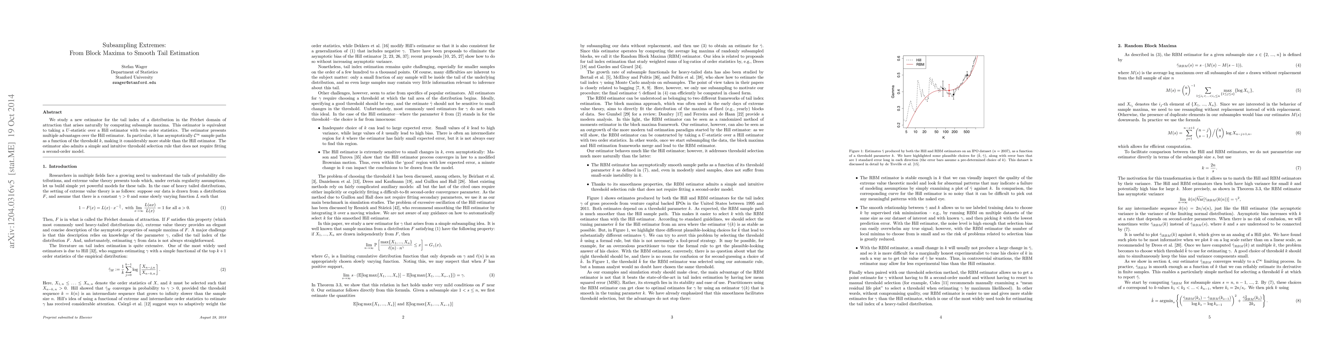 We study a new estimator for the tail index of a distribution in the Frechet domain of attraction that arises naturally by computing subsample maxima. This estimator is equivalent to taking a U-statistic over a Hill estimator with two order statistics. The estimator presents multiple advantages over the Hill estimator. In particular, it has asymptotically smooth sample paths as a function of the threshold k, making it considerably more stable than the Hill estimator. The estimator also admits a simple and intuitive threshold selection rule that does not require fitting a second-order model. Journal of Multivariate Analysis, 130, 2014
