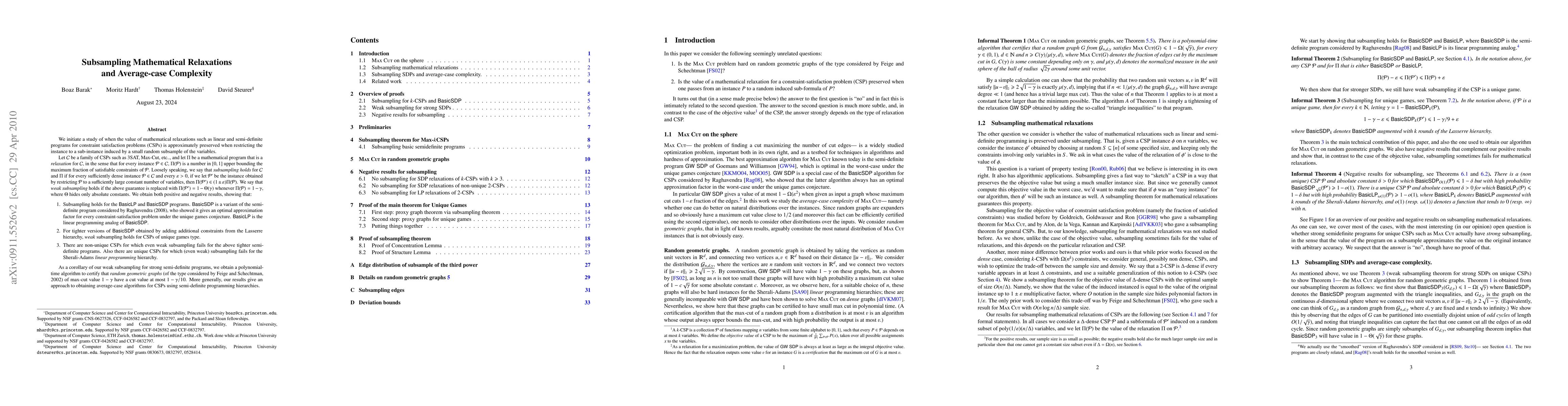 We initiate a study of when the value of mathematical relaxations such as linear and semidefinite programs for constraint satisfaction problems (CSPs) is approximately preserved when restricting the instance to a sub-instance induced by a small random subsample of the variables. Let $C$ be a family of CSPs such as 3SAT, Max-Cut, etc., and let $\Pi$ be a relaxation for $C$, in the sense that for every instance $P\in C$, $\Pi(P)$ is an upper bound the maximum fraction of satisfiable constraints of $P$. Loosely speaking, we say that subsampling holds for $C$ and $\Pi$ if for every sufficiently dense instance $P \in C$ and every $\epsilon>0$, if we let $P'$ be the instance obtained by restricting $P$ to a sufficiently large constant number of variables, then $\Pi(P') \in (1\pm \epsilon)\Pi(P)$. We say that weak subsampling holds if the above guarantee is replaced with $\Pi(P')=1-\Theta(\gamma)$ whenever $\Pi(P)=1-\gamma$. We show: 1. Subsampling holds for the BasicLP and BasicSDP programs. BasicSDP is a variant of the relaxation considered by Raghavendra (2008), who showed it gives an optimal approximation factor for every CSP under the unique games conjecture. BasicLP is the linear programming analog of BasicSDP. 2. For tighter versions of BasicSDP obtained by adding additional constraints from the Lasserre hierarchy, weak subsampling holds for CSPs of unique games type. 3. There are non-unique CSPs for which even weak subsampling fails for the above tighter semidefinite programs. Also there are unique CSPs for which subsampling fails for the Sherali-Adams linear programming hierarchy. As a corollary of our weak subsampling for strong semidefinite programs, we obtain a polynomial-time algorithm to certify that random geometric graphs (of the type considered by Feige and Schechtman, 2002) of max-cut value $1-\gamma$ have a cut value at most $1-\gamma/10$.