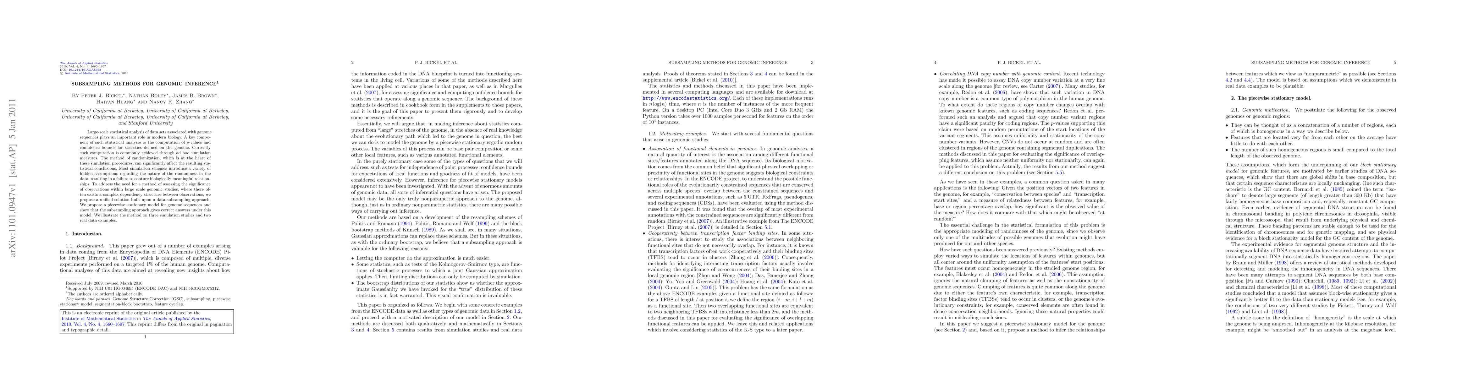 This paper proposes a subsampling method for genomic inference to accurately compute $p$-values and confidence bounds in large-scale genomic studies, addressing the limitations of current ad hoc simulation measures by introducing a piecewise stationary model. The method is validated through simulation studies and real data examples.