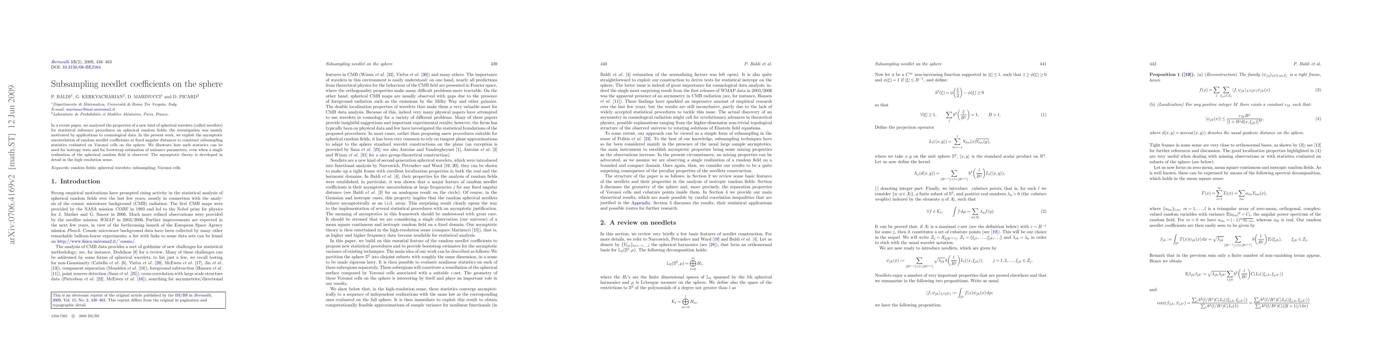 In a recent paper, we analyzed the properties of a new kind of spherical wavelets (called needlets) for statistical inference procedures on spherical random fields; the investigation was mainly motivated by applications to cosmological data. In the present work, we exploit the asymptotic uncorrelation of random needlet coefficients at fixed angular distances to construct subsampling statistics evaluated on Voronoi cells on the sphere. We illustrate how such statistics can be used for isotropy tests and for bootstrap estimation of nuisance parameters, even when a single realization of the spherical random field is observed. The asymptotic theory is developed in detail in the high resolution sense.